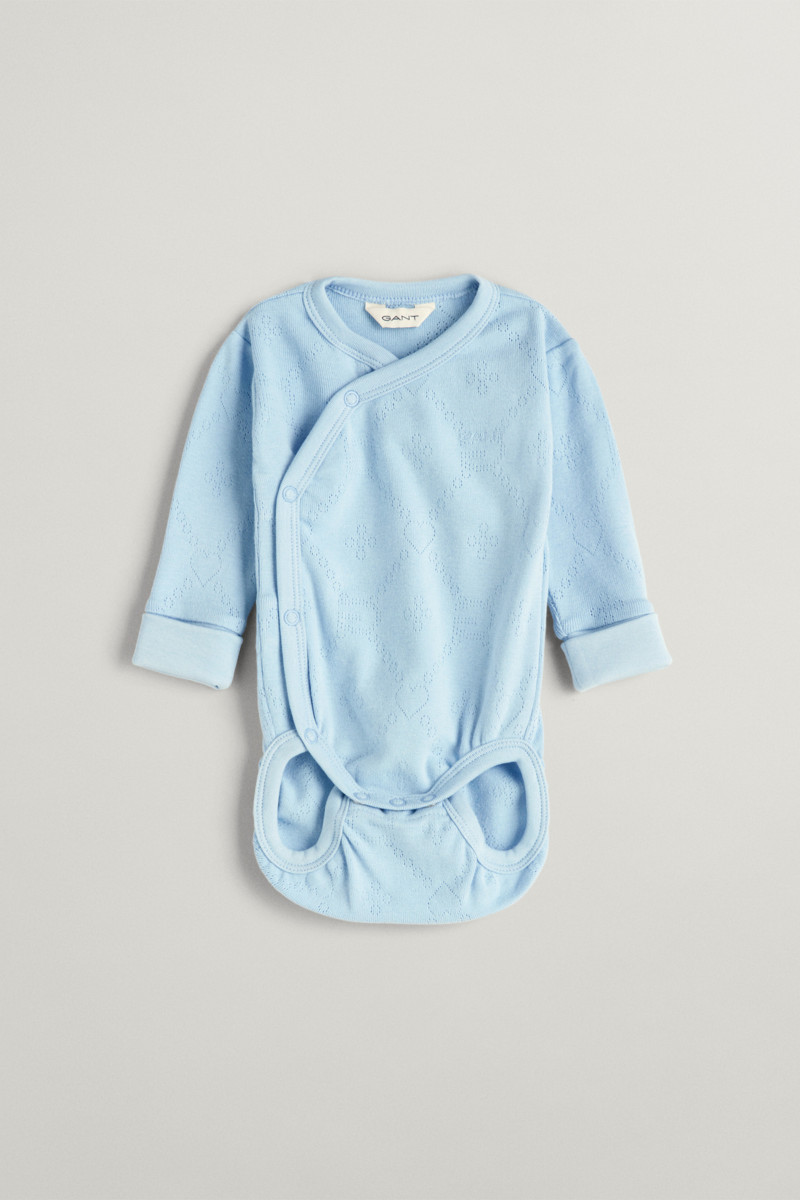 Újszülött wrap body, amely hosszú ujjakkal van ellátva. A mellkason található minimalista márkafelirat összhangban van a bájosan texturált kötött anyaggal. A teljes egészében patentos záródással ellátott darab lehetővé teszi a gyors és rendkívül kényelmes öltöztetést. A finom jersey kiváló minőségű organikus pamutszálból készült, amely bársonyos puhaságával, légáteresztő képességével tűnik ki, ugyanakkor kellemesen melegen tart. A prémium minőségű anyagösszetétel garantálja a rendkívül kényelmes érzést és a baba elégedettségét egész napos viselet során.