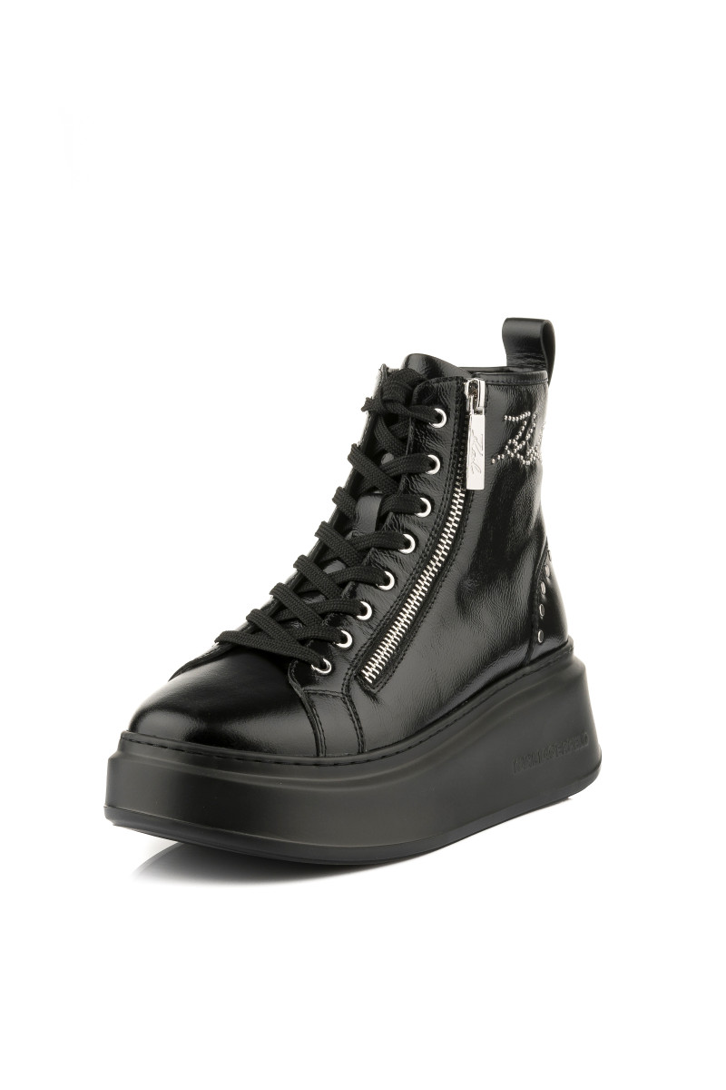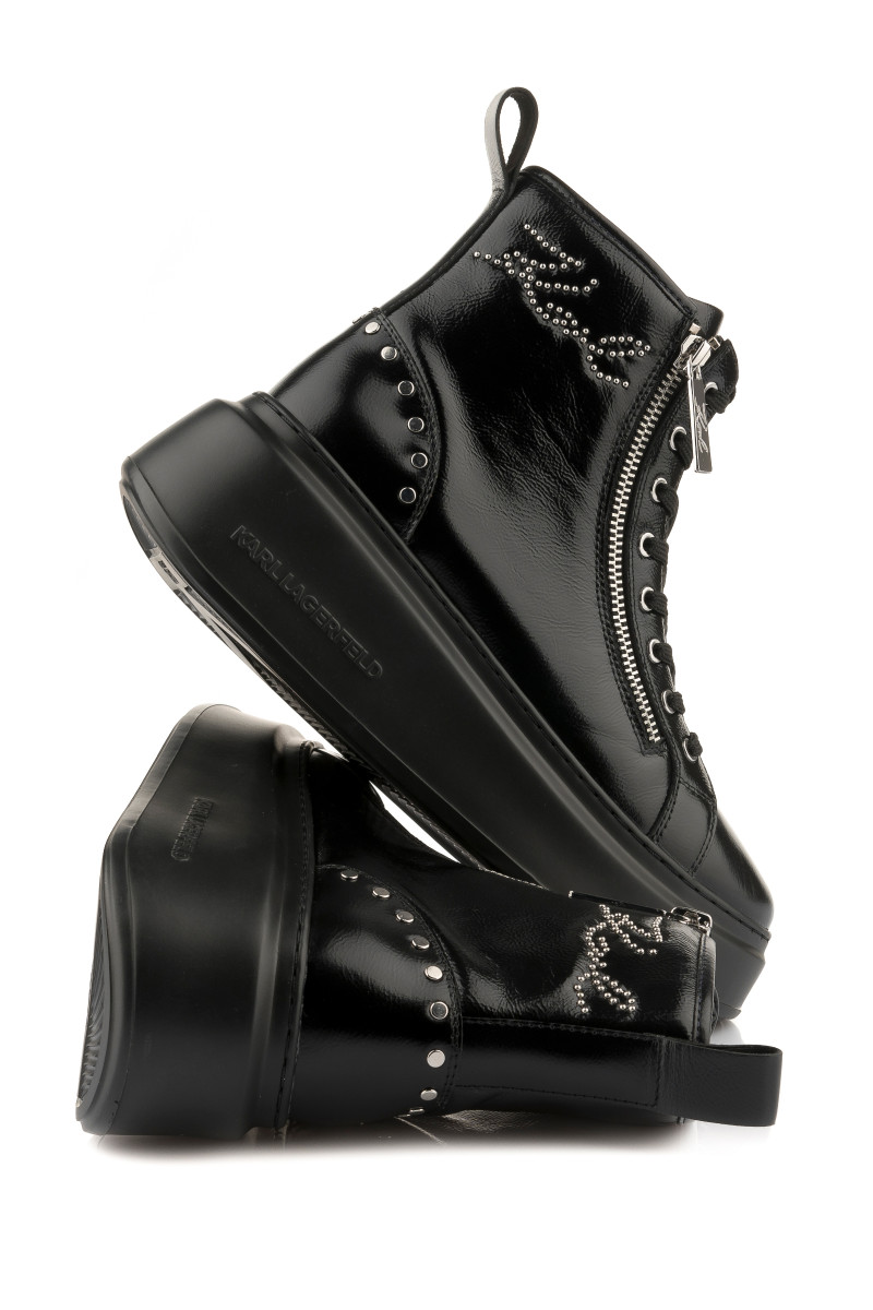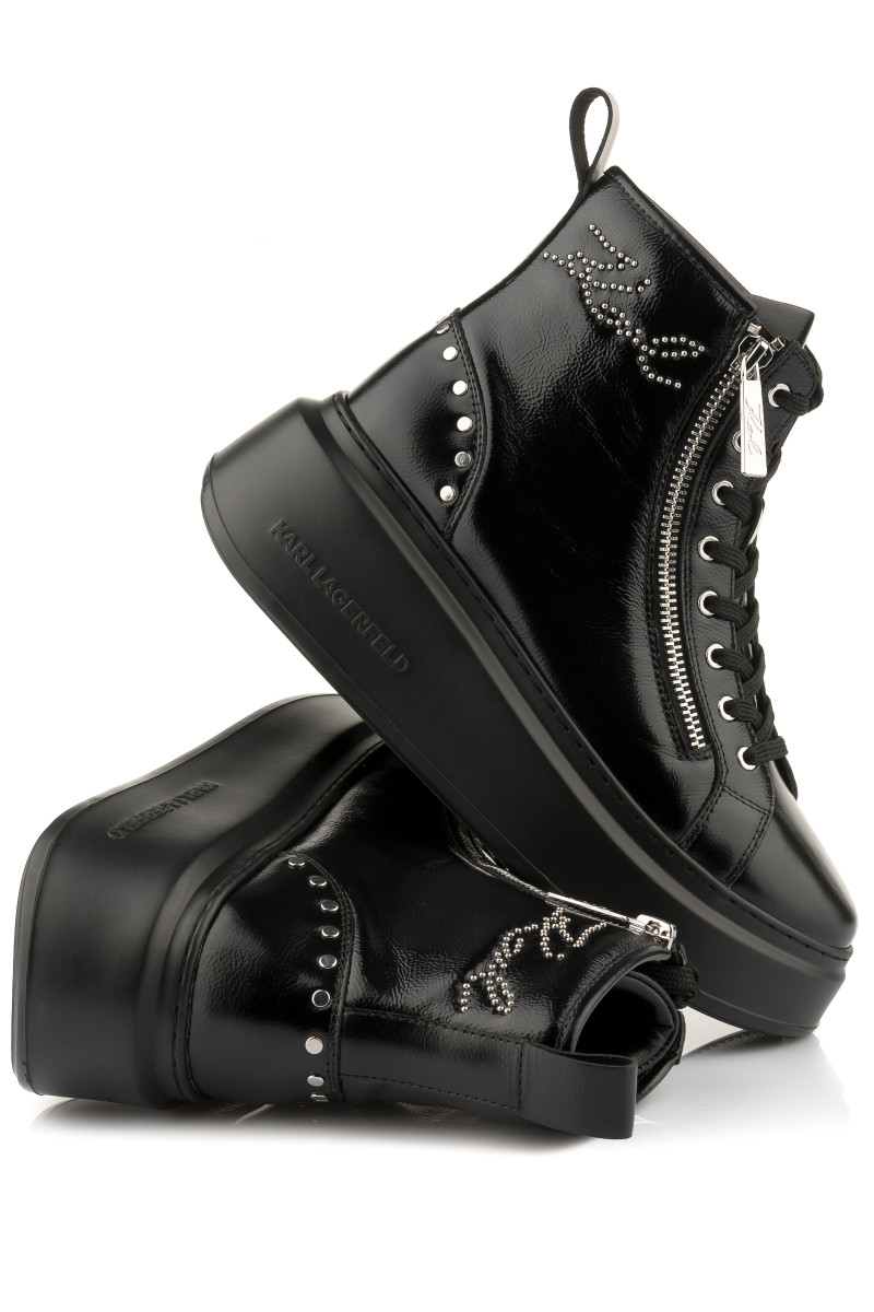 Női bokacsizma, amely prémium minőségű, fényes marhabőrből készült és csillogó kövekkel kirakott KARL Signature logó díszíti. A rockos, ugyanakkor elegáns dizájnú lábbeli kerek orr résszel és fűzős záródással ellátott. Külső oldalán cipzárral és a sarokrészen ezüstszínű szegecsekkel. Nem hiányozhat róla a bőrből készült hurok sem, amely a kényelmes felhúzást teszi lehetővé. A magas, könnyű és rugalmas, szintetikus anyagból készült talprészt Karl logó díszíti. Rendkívül stílusos lábbeli, amely őszi öltözékének fénypontjává válik.