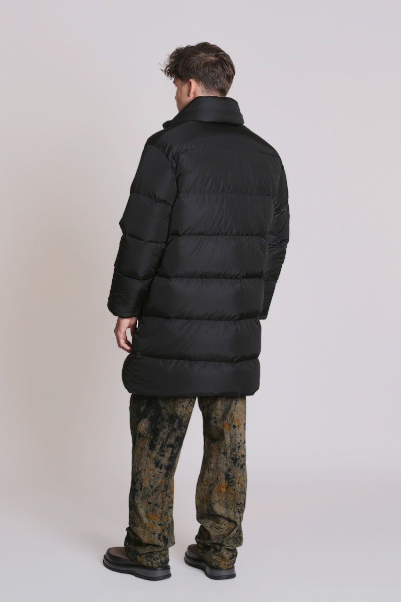 Férfi egyenes szabású pehelykabát, amelynek külső anyaga és bélése 100%-ban újrahasznosított szintetikus szálból készült. Egyszínű dizájn praktikus állógallérral a nyaknál és levehető kapucnival, cipzárral és patentokkal záródik. Nem hiányozhatnak róla a patkózárral ellátott felvarrt zsebek és oldalsó kéznyílások. Az anyagösszetétel minőségi kacsapehely töltettel garantálja a tökéletes melegséget, légáteresztő képességet és kellemes érzetet viselés közben. Nagyon praktikus és kényelmes darab, ami stílusosan kiegészíti a téli öltözékedet.