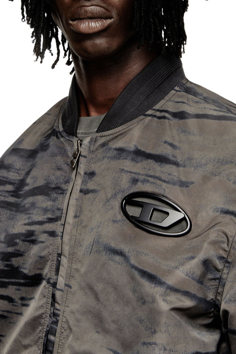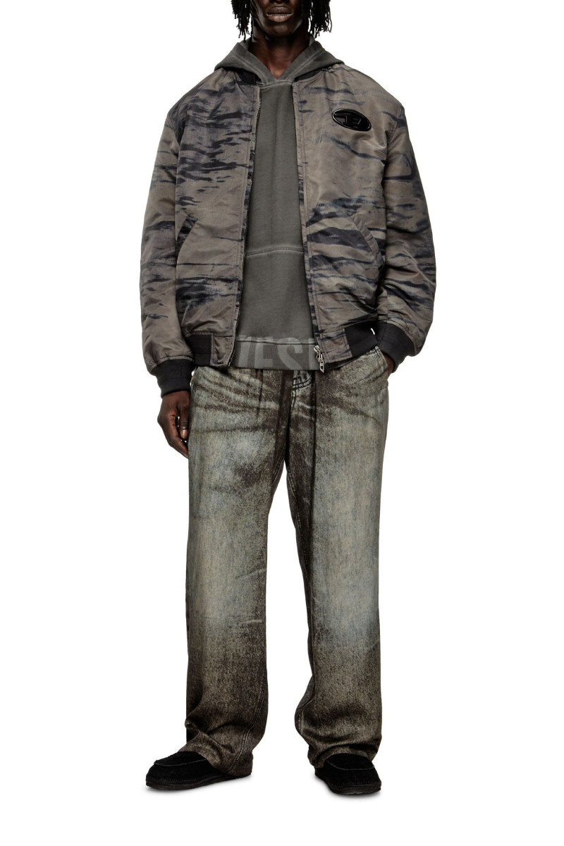Férfi téli bomber dzseki. Laza regular fit szabás. Készült újrahasznosított nylon szaténból, melyet egy olyan nyomtatás díszít, ami a farmerhatást és a Diesel márkára jellemző koszeffektet utánozza. Díszítve fémből készült ovális ikonikus D-logós plakettel a mellkason – a kovácsolt elem egy kivágásba van illesztve, ami átlátást nyújt az alsó rétegre. Bordázott mandzsetták és szegély. Kétirányú cipzárral záródik. Zsebeknél szegélyek. Béléses melegítő réteg. A modell IT méret 48-as méretet visel és 188 cm magas. A méretezés megfelel a szokásos márkajelöléseknek, választáskor válaszd a megszokott méretedet.