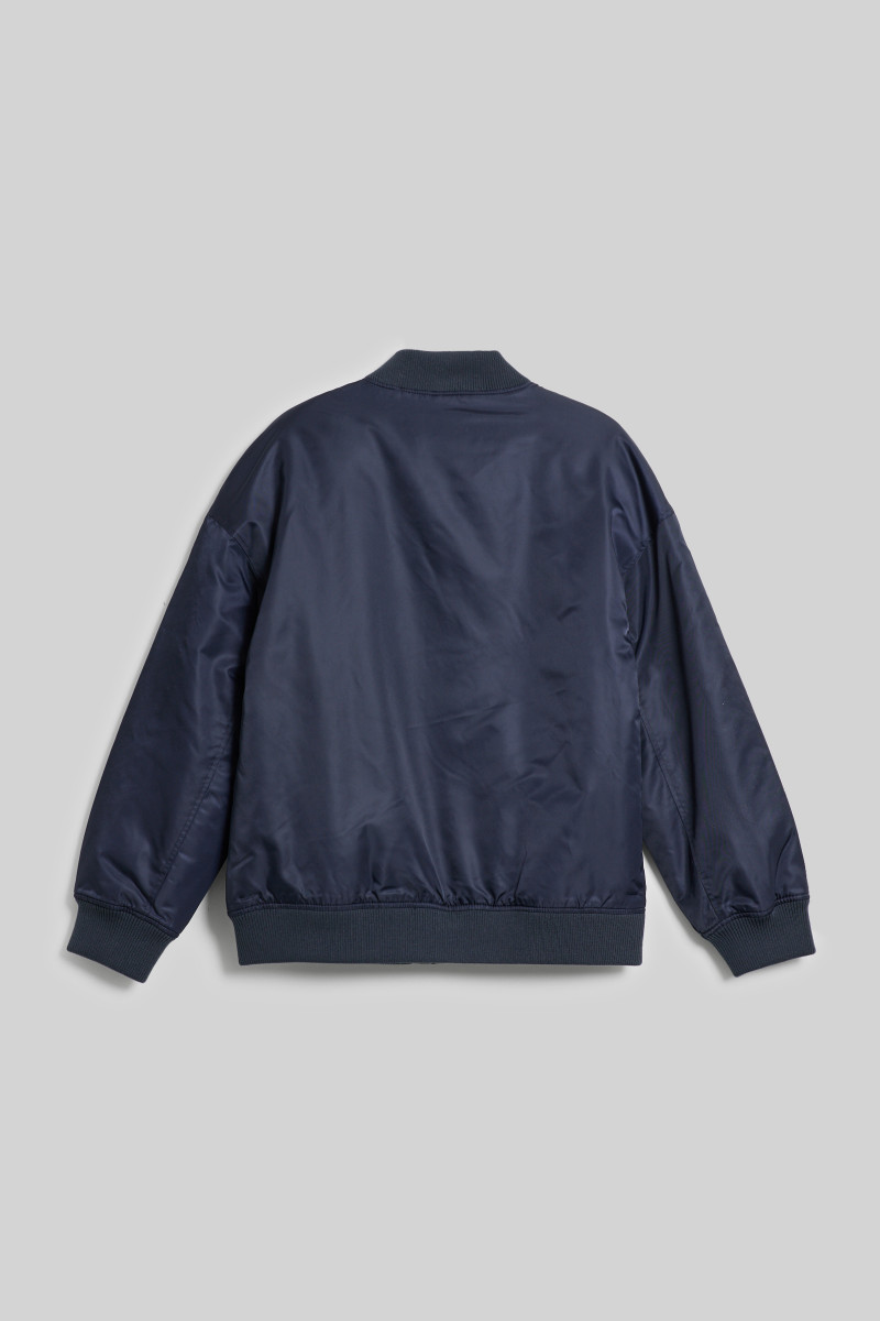 Gyermek bomberdzseki, amely jellegzetes szegéllyel van ellátva a nyak körül, az ujjakon és a derékon. Gombos záródású, kontrasztos márkajelzéssel a mellkason és két oldalsó ferde zsebbel. Felületi anyaga könnyű, mégis tartós, prémium minőségű szálból készült, amely ellenáll a könnyű esőnek és szélnek. Az üreges szálas töltet kellemesen melegen tart és alacsony karbantartási igényt biztosít. Nagyon kényelmes darab, amely a preppy stílus elengedhetetlen része.