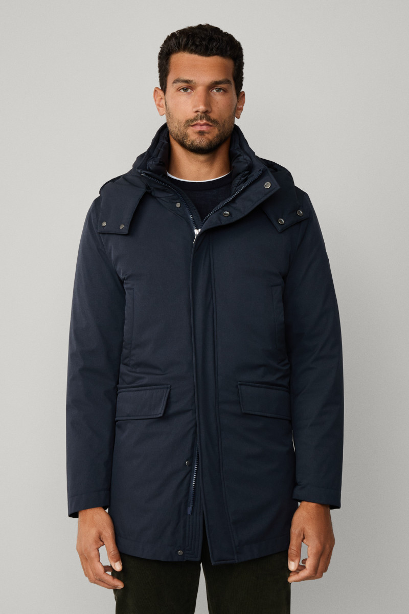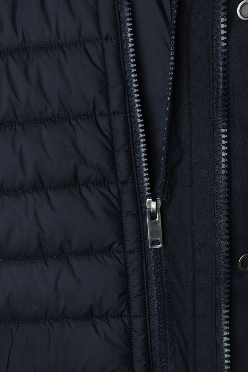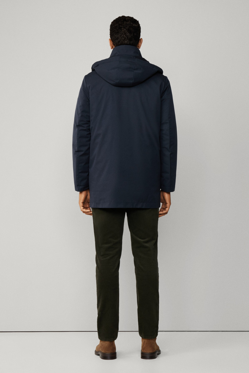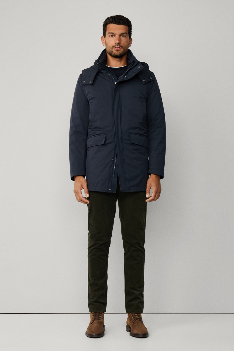 Férfi dzseki, amely kivehető béléssel van ellátva. Egyenes szabású, combközepéig érő hosszúságú és kétirányú cipzárral záródik, amely magasabb állógallérban végződik és elegáns, gombos hajtóka fedi. A lezser, ugyanakkor elegáns dizájnú darab lecsatolható kapucnival van kiegészítve. Két mellzsebbel és két tágas oldalsó zsebbel, amelyek hajtókával vannak ellátva. Felületi anyaga ellenálló, vízálló és megbízhatóan véd a szeles időjárás során. Praktikus részlettel, kivehető bélés formájában, amely kialakításának köszönhetően önálló felső rétegként is viselhető. Nagyon kényelmes darab, amely a praktikusságot stílusos kinézettel ötvözi.