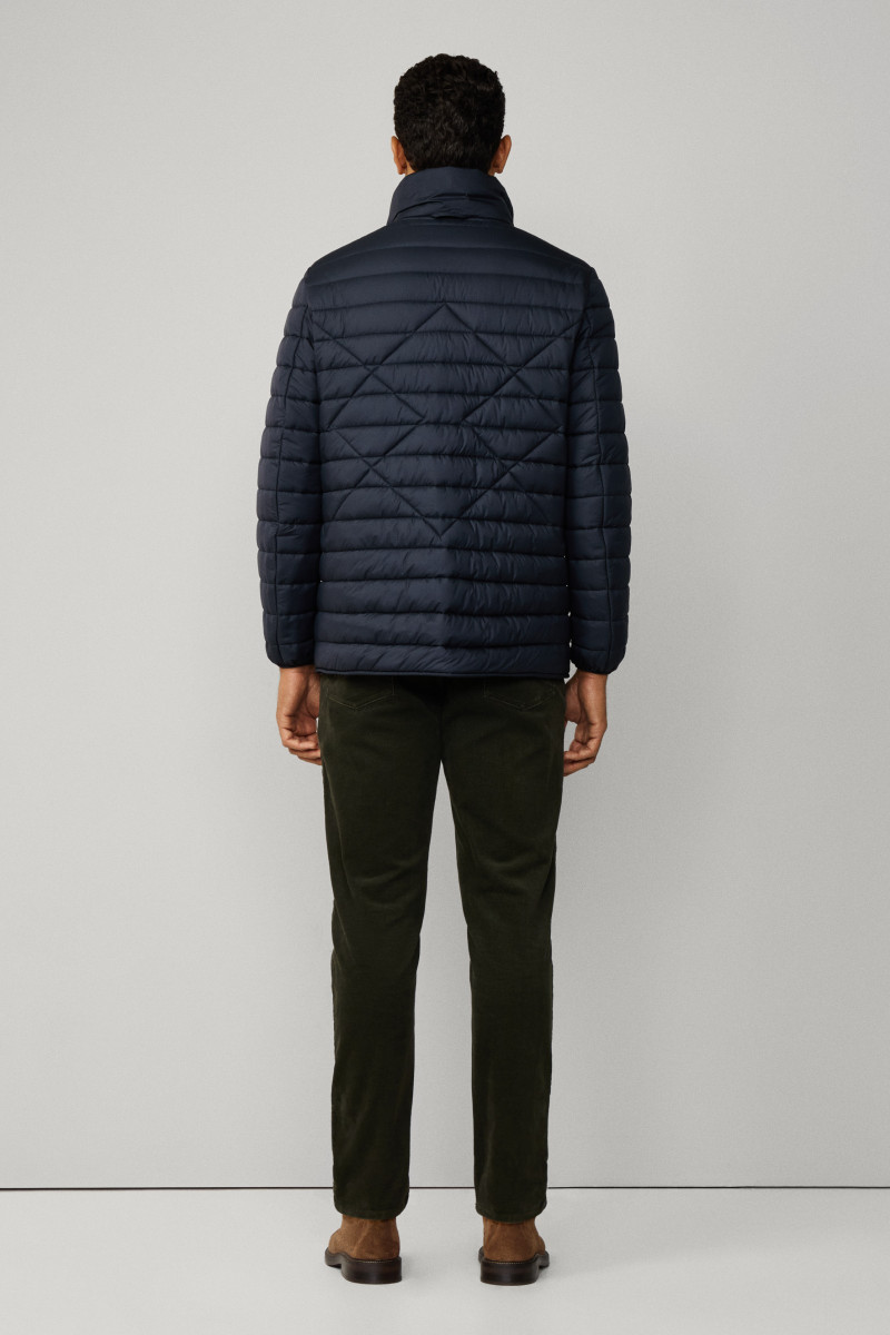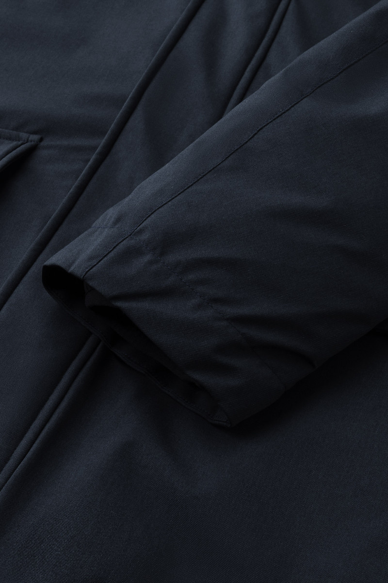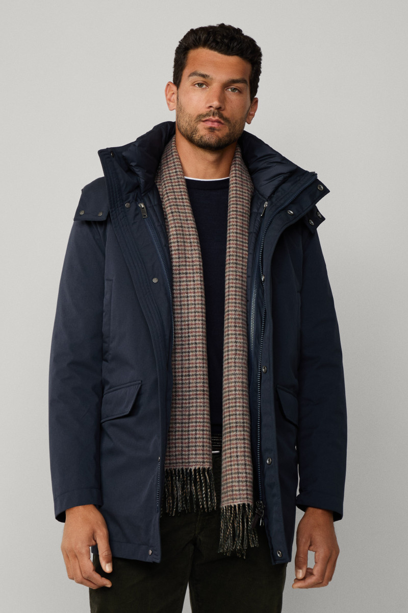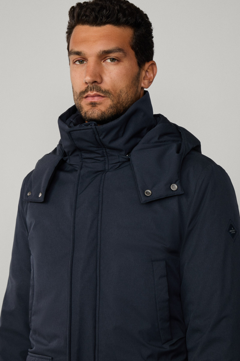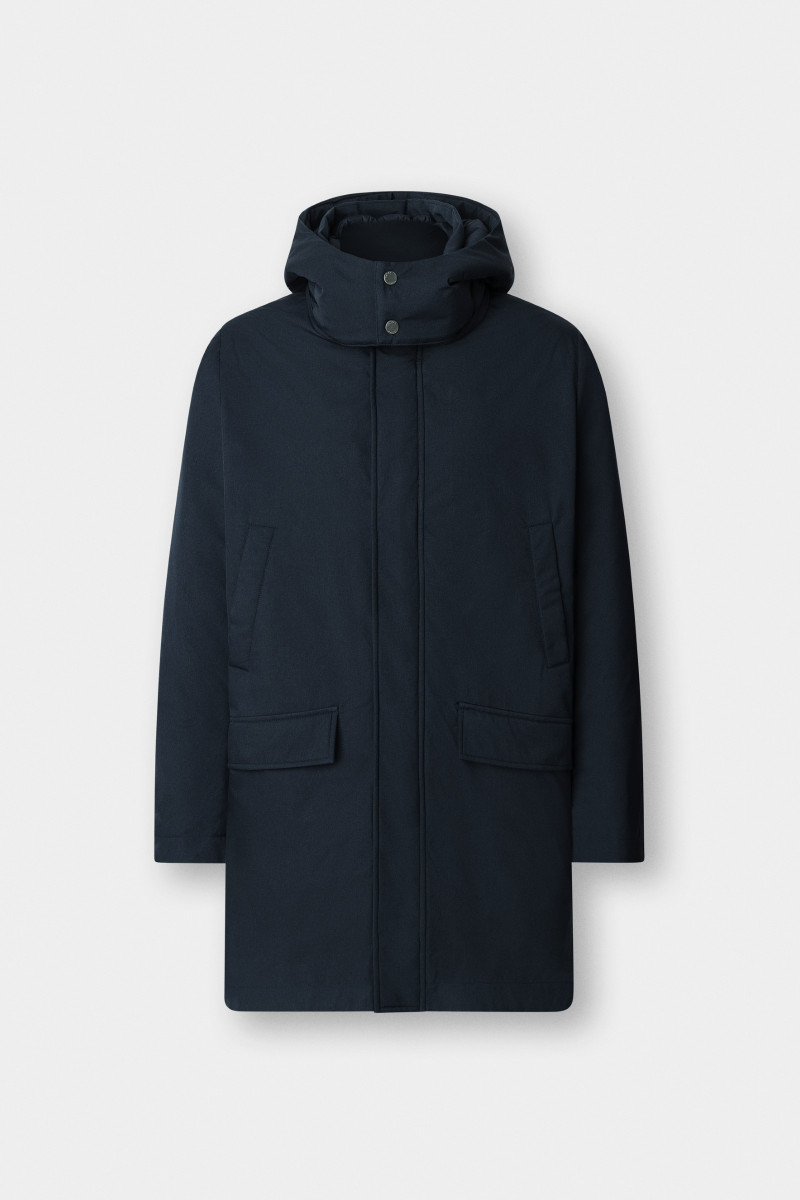 Férfi dzseki, amely kivehető béléssel van ellátva. Egyenes szabású, combközepéig érő hosszúságú és kétirányú cipzárral záródik, amely magasabb állógallérban végződik és elegáns, gombos hajtóka fedi. A lezser, ugyanakkor elegáns dizájnú darab lecsatolható kapucnival van kiegészítve. Két mellzsebbel és két tágas oldalsó zsebbel, amelyek hajtókával vannak ellátva. Felületi anyaga ellenálló, vízálló és megbízhatóan véd a szeles időjárás során. Praktikus részlettel, kivehető bélés formájában, amely kialakításának köszönhetően önálló felső rétegként is viselhető. Nagyon kényelmes darab, amely a praktikusságot stílusos kinézettel ötvözi.