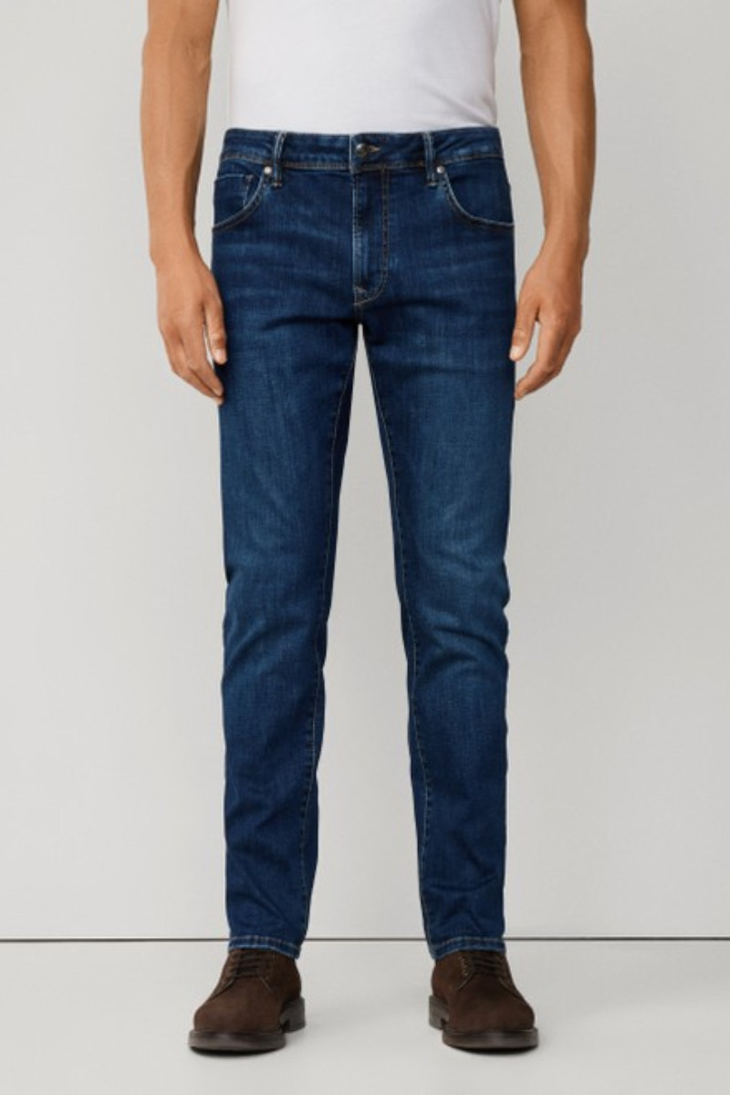 Slim fit szabású férfi farmernadrág. Időtálló dizájnú darab, amely koptatott részekkel és kontrasztos varrással van ellátva. Klasszikus magasságú derékrész egészít ki, amely márkajelzéses gombbal és cipzárral záródik. Nem hiányoznak róla az övhurkok, valamint a bőrből készült címke sem, amelyet a márka felirata díszít és a hátsó zseb felett helyezkedik el. Anyaga rugalmas, kellemes tapintású szövetből készült, minőségi pamutszál és elasztán kombinációjából, így sokáig megőrzi eredeti alakját, mindenekelőtt azonban tökéletesen illeszkedik viselője alakjához és rendkívül kényelmes. Sokoldalúan kombinálható darab, amely kedvenc részévé válik a mindennapok öltözékének.