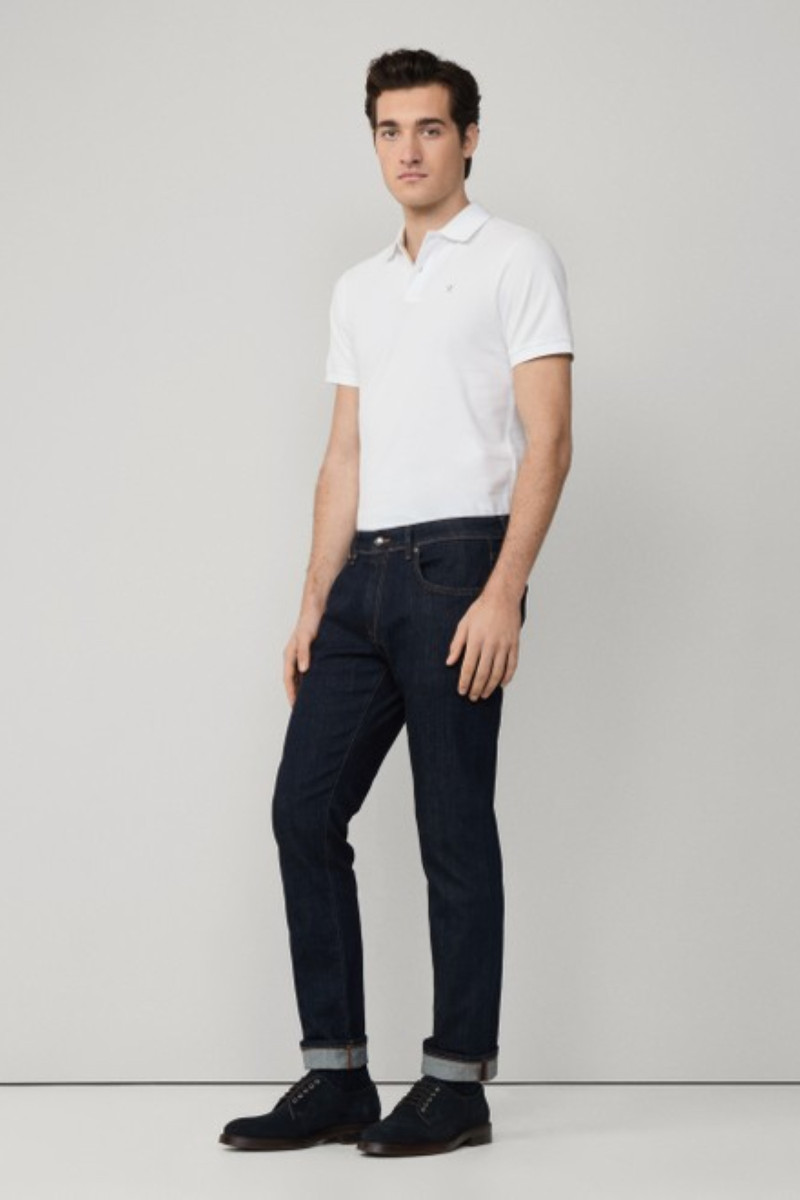 Slim fit férfi farmernadrág. Időtálló dizájnú darab, klasszikus magasságú derékrésszel, amely márkajelzéses gombbal és cipzárral, valamint övhurkokkal van ellátva. Nem hiányozhat róla a bőrből készült címke sem, amely márkajelzéssel van kiegészítve és a hátsó zseb felett található. Anyaga rendkívül puha szövetből készült, prémium minőségű pamutszálból és a hozzáadott elasztánnak köszönhetően garantálja a rendkívül kellemes érzést viselés közben. Előnyös darab, amely elengedhetetlen részévé válik formális vagy lezser ruhatárának.