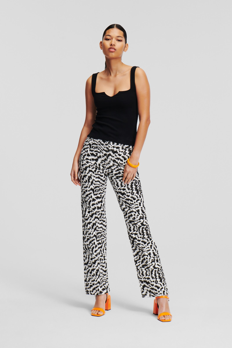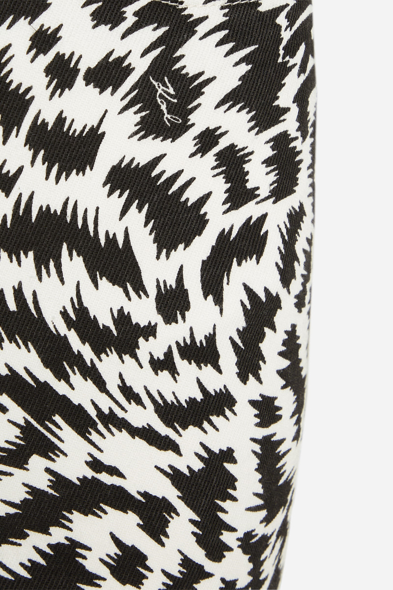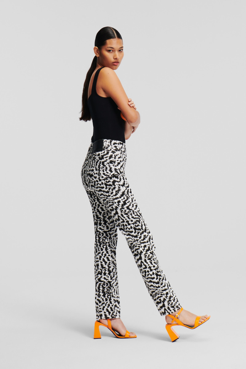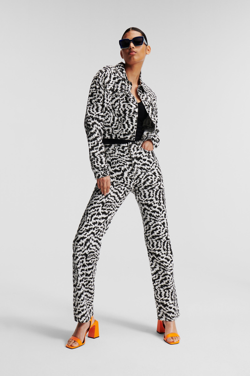 Női farmer nadrág, amely egyenes szárú és magas derékkal van ellátva. Az előnyös sziluettű darabot merész fekete-fehér állatmintás Karl-logó díszíti. Az anyagösszetétel tökéletes légáteresztést, puhaságot és kellemes viseletet garantál. Egy rendkívül stílusos darab, amely lezser öltözékének középpontjává válik.