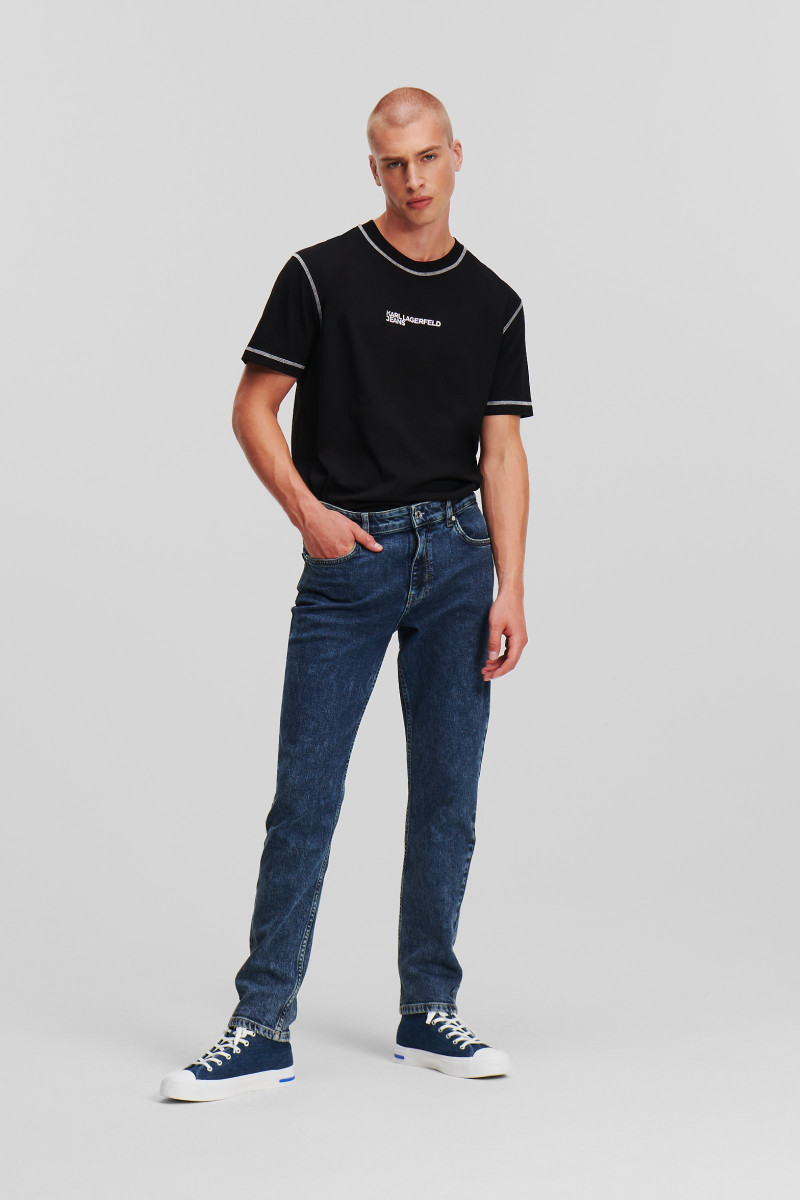 Férfi skinny farmer nadrág, amely szűk szabású, középmagas derékkal és cipzáras záródással. A farmer ötzsebes kialakítású, tengerészkék színű és az univerzális ruhatár alapdarabja. A hátsó zseben kontrasztos logós részlet található, a ,,Karl Lagerfeld Jeans" kollekcióból. A farmer anyaga organikus pamutszálak keverékéből készült, amely testhezálló illeszkedést és maximális viselési kényelmet garantál. Tökéletes és időtálló darab, amely ruhatárának szerves részévé válik.