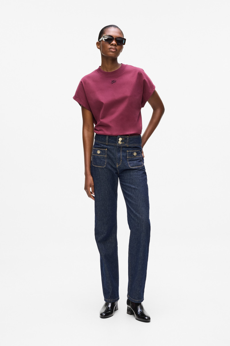 Női farmer nadrág lazább fazonnal, hosszú egyenes szárakkal. Sötétkék design magas derekú, öt zsebbel, elől felvarrt zsebekkel és övbújtatókkal, amelyeket egy fekete Karl logó díszít a hátsó zseb felett. A könnyed farmer anyag 100%-ban organikus pamutból készült, erősségével bír, de viselés során gyönyörűen alkalmazkodóvá, puha és nagyon kellemes tapintásúvá válik. Egy kiválóan kombinálható darab, amely stílusosan kiegészíti a lezser öltözékedet.