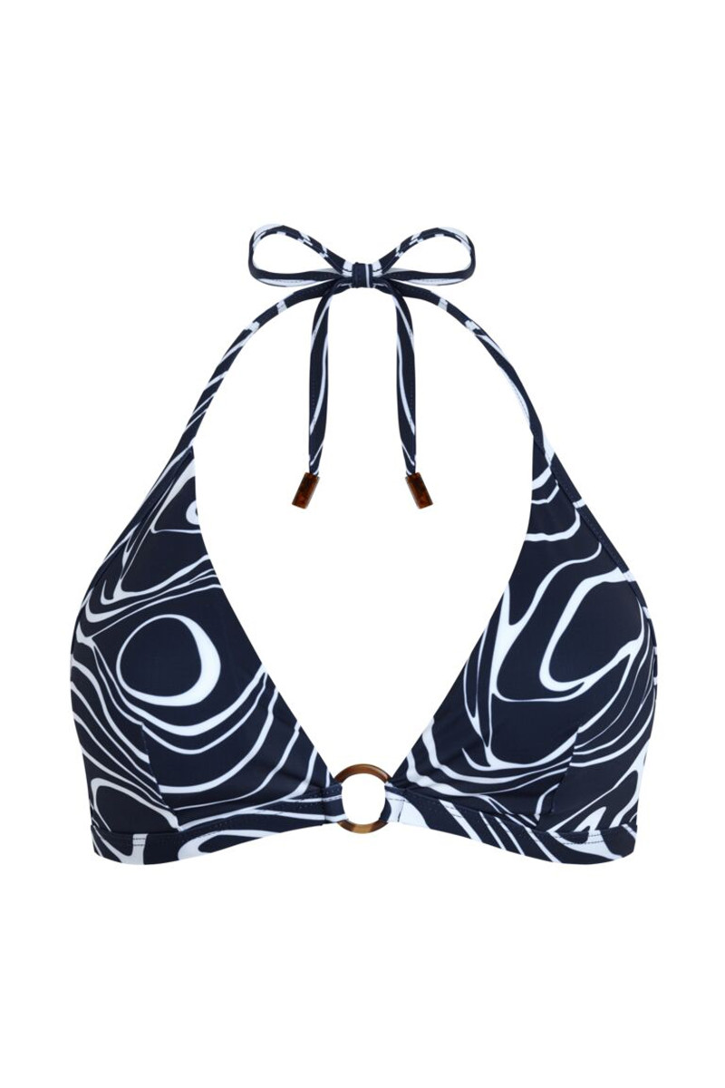 Női bikini felsőrész, amelyet teljes felületén hullámos minta díszít. Az elegáns dizájnú darabot a nyaknál és a hátoldalon megköthető pántok, valamint elülső oldalán mutatós gyűrű teszi érdekessé. A kosarak kivehető, könnyű betétekkel vannak ellátva. A minőségi anyagösszetételnek és megmunkálásnak köszönhetően maximális kényelmet garantál viselés közben. Tökéletesen stílusos stranddarab, amely garantáltan feldobja a nyarat.