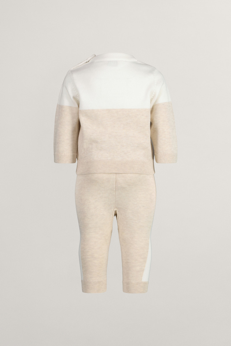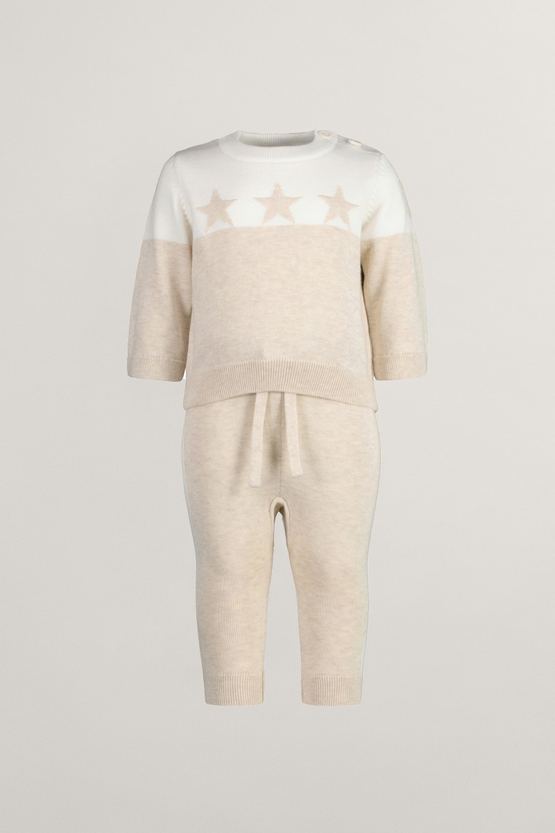 Egyedi gyermek szett, amely pulóverből és kötött nadrágból áll. Rugalmas derékrésszel ellátott. A kerek nyakkivágású pulóvert a vállakon gombok egészítik ki, amelyek lehetővé teszik a könnyebb és gyorsabb öltöztetést. A nadrág egyenes szabású és praktikus, kellemesen puha szegélyek zárják, amelyek megakadályozzák a lábszár kényelmetlen fel- vagy lecsúszását. Bársonyosan puha tapintású, 100%-ban organikus pamutszálból készült. Felületét csillag minta díszíti, amely színben összeillik a kényelmes és stílusos megjelenésű szett kéttónusú kialakításával.