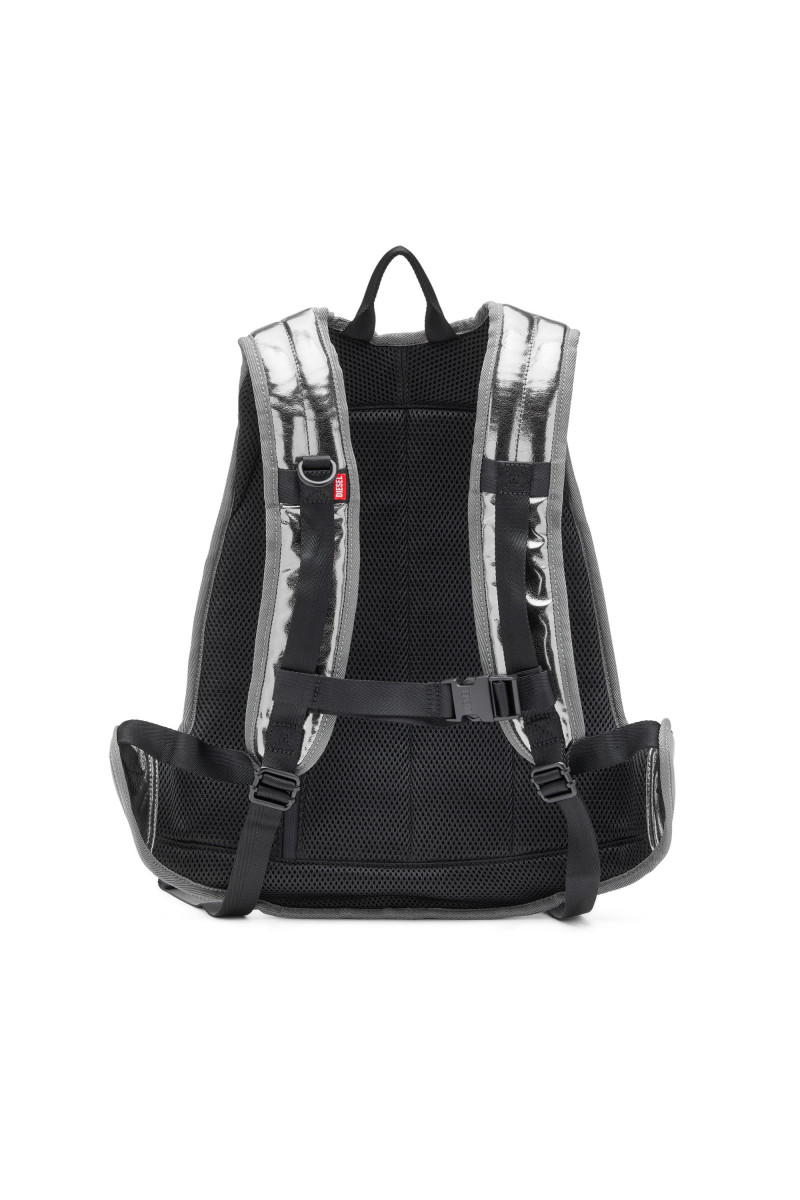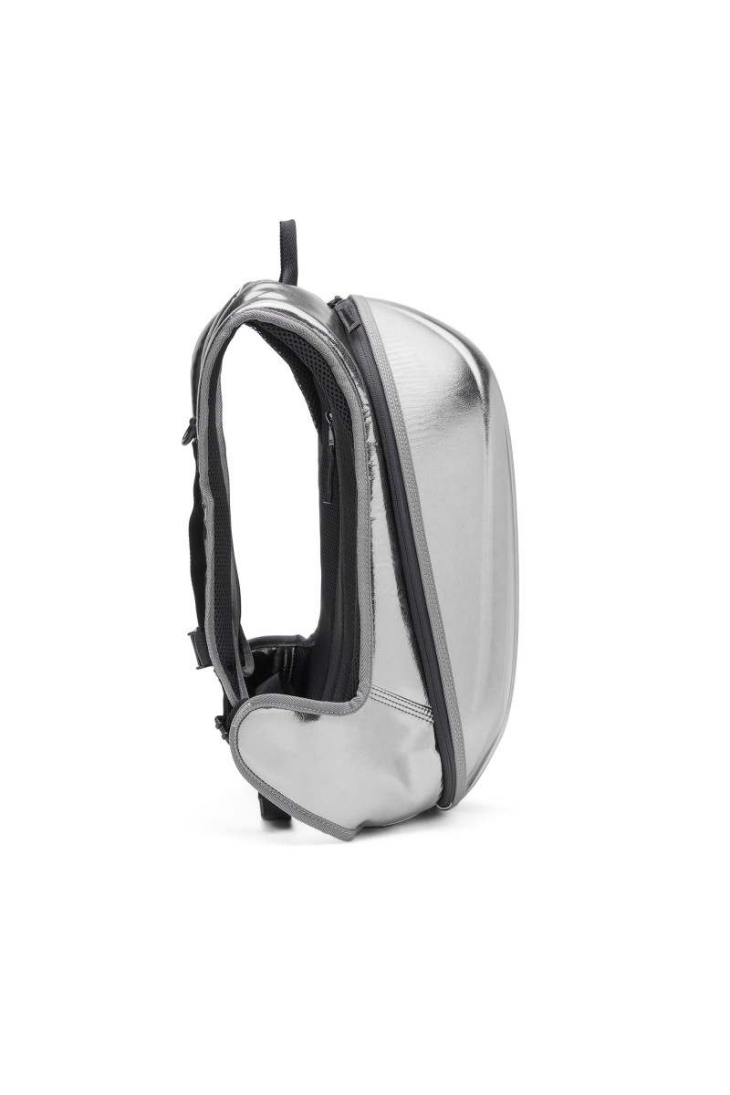 Férfi hátizsák. Teknőspáncél által inspirált masszív kialakítás. Fémes színű PU-ból készült, mega dombornyomott logóval és neon részekkel. Hosszában állítható ergonomikus vállpántokkal és belső rekesszel a csúcstechnológiás felszerelések számára. Van egy felső fogantyú, mellkasi pánt és karabiner. Cipzáras hátsó zseb. Kétirányú cipzáras záródás.