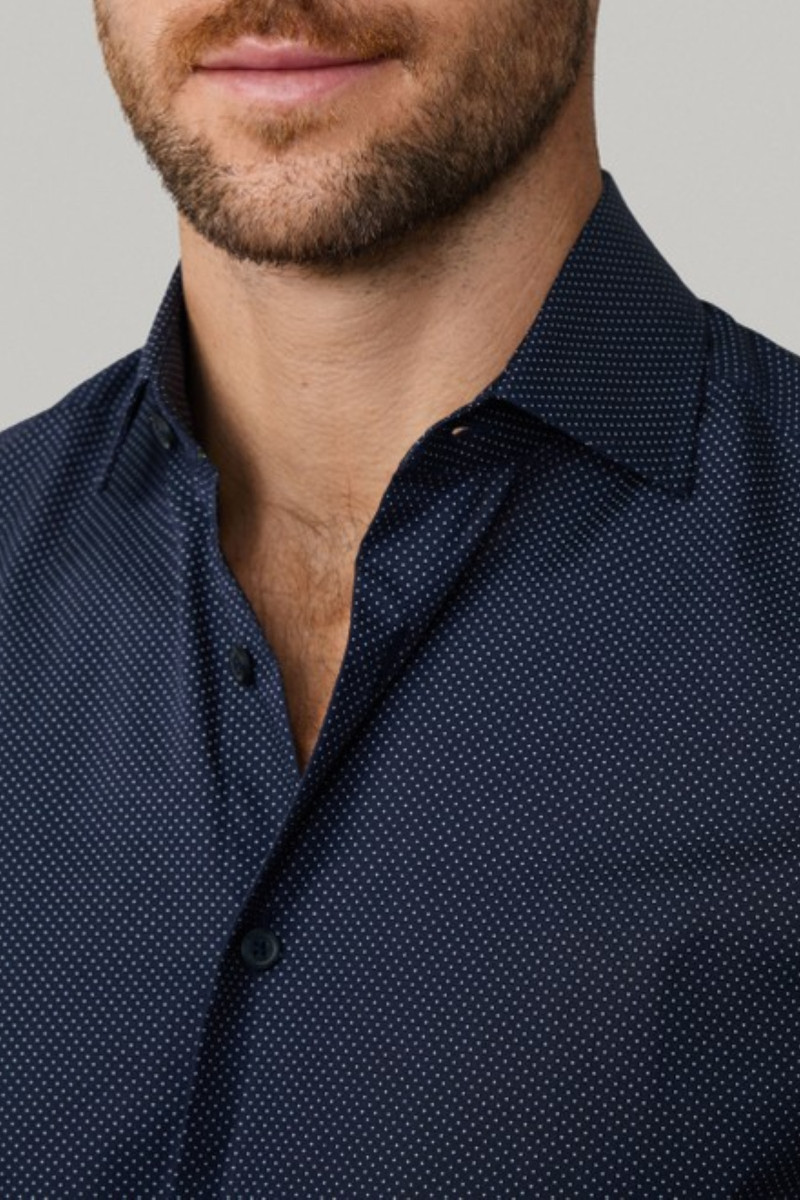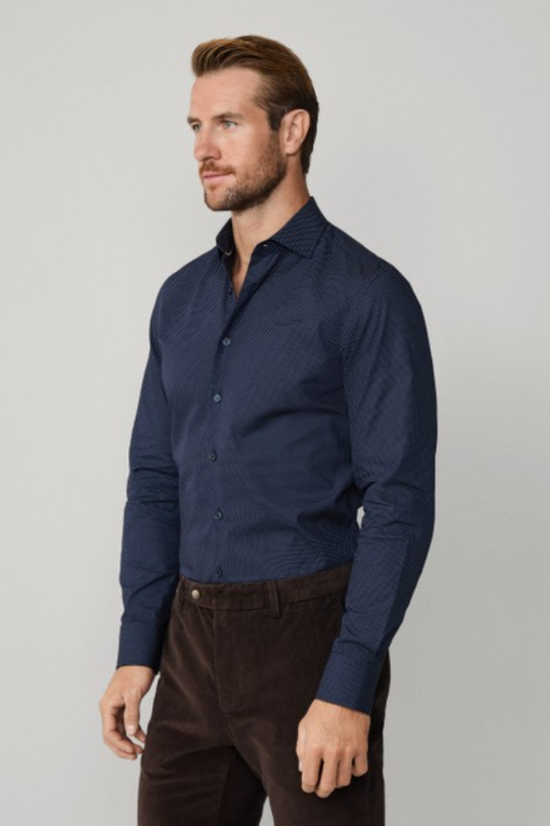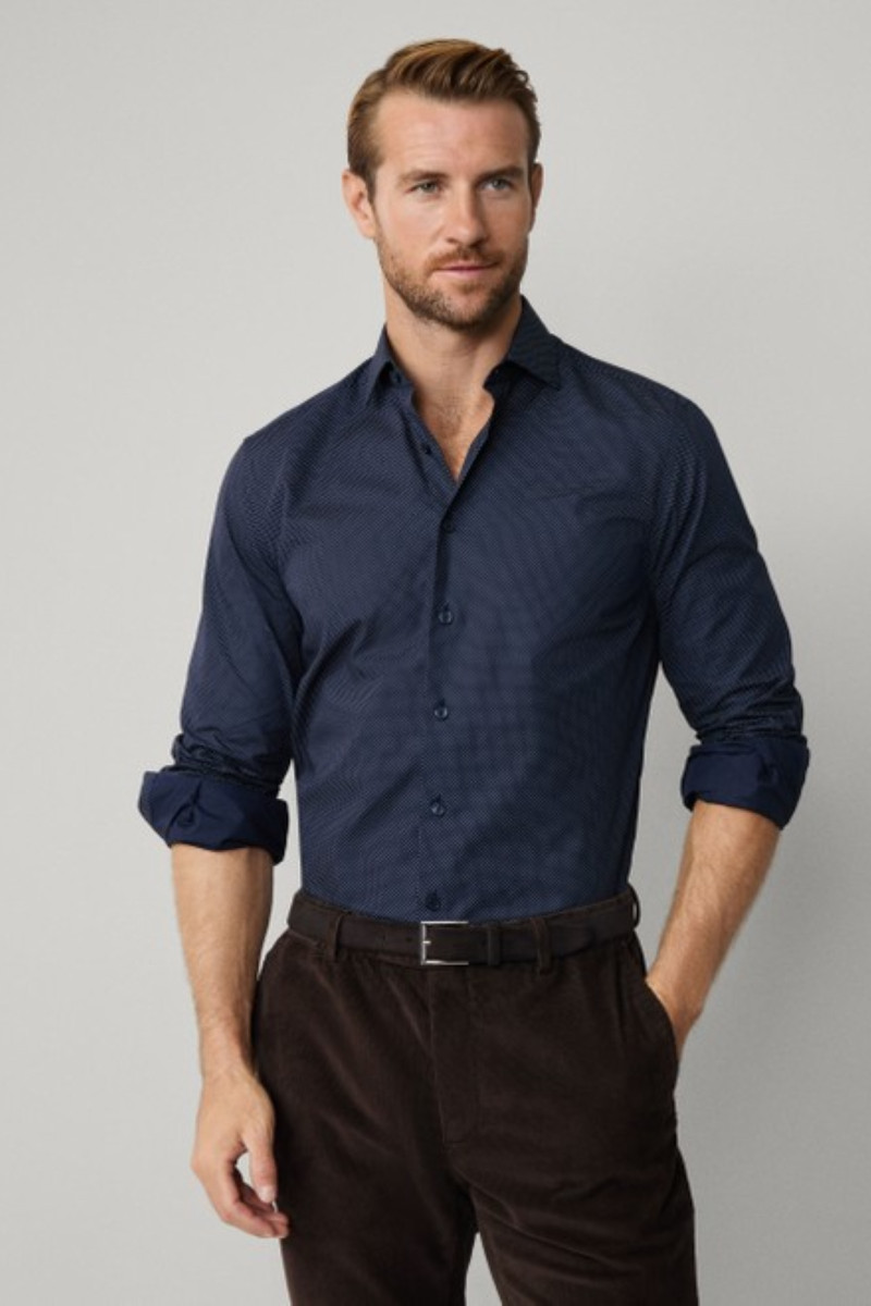 Hosszú ujjú férfi ing, amely rendkívül előnyös szabású és könnyű poplin anyagból készült. Felületét apró pöttyös minta díszíti. A modern, smart casual dizájnú darabot nyitottabb típusú gallér és klasszikus gombos záródás egészíti ki. Anyaga prémium minőségű pamutszálból készült, így légáteresztő képességet és rendkívül kellemes viseletet garantál. Stílusos alternatívájává válik a formális ingnek, amely garantáltan feldobja munkahelyi öltözékét.