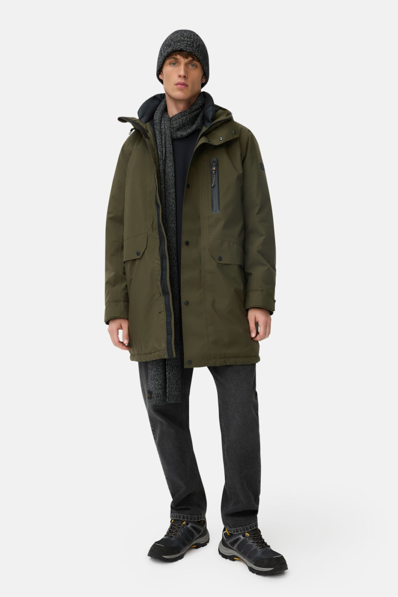 Férfi télikabát, amely kapucnival és funkcionális TeXXXactive kezeléssel van ellátva. Laza szabású, térdig érő hosszúságú darab, amely remekül megmunkált, cipzáras és patentos záródású - ezt praktikus hajtóka fedi. Tágas oldalzsebekkel, amelyek hajtókával vannak kiegészítve. Az ellenálló, kellemesen puha felületi anyag prémium minőségű megmunkálásának köszönhetően vízálló, és megbízhatóan véd a széles és hideg időjárás során. Az üreges szálas töltet kellemesen melegen tart és alacsony karbantartási igényt garantál. Rendkívül kényelmes, modern megjelenésű darab, amely ízlésesen feldobja lezser és szabadidős öltözetekét.