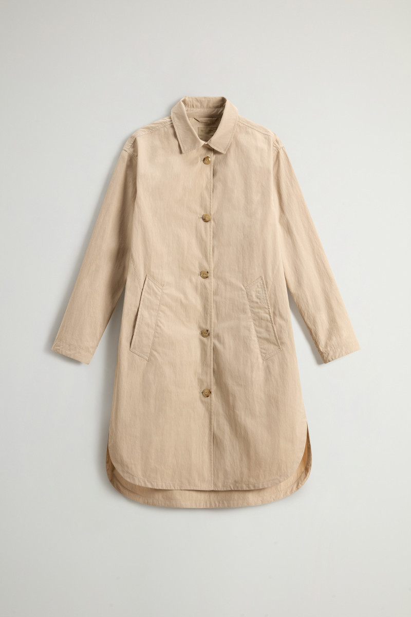 Női kabát laza szabásban, nagyon tartós és könnyű pamut anyagból. A klasszikus gallérral és gombos záródással ellátott egyszínű dizájnt hátul állítható fülek egészítik ki a kényelmes illeszkedés érdekében, valamint a lekerekített szegély enyhén kivágott oldalakkal. A bal zsebén egy tónusú Woolrich logó van hímezve. Tökéletesen sokoldalú darab, amely stílusosan kiegészíti a tavaszi öltözéket.