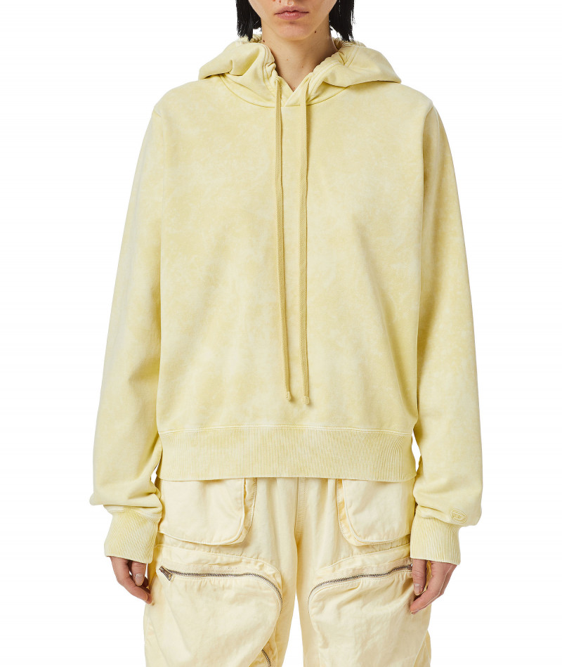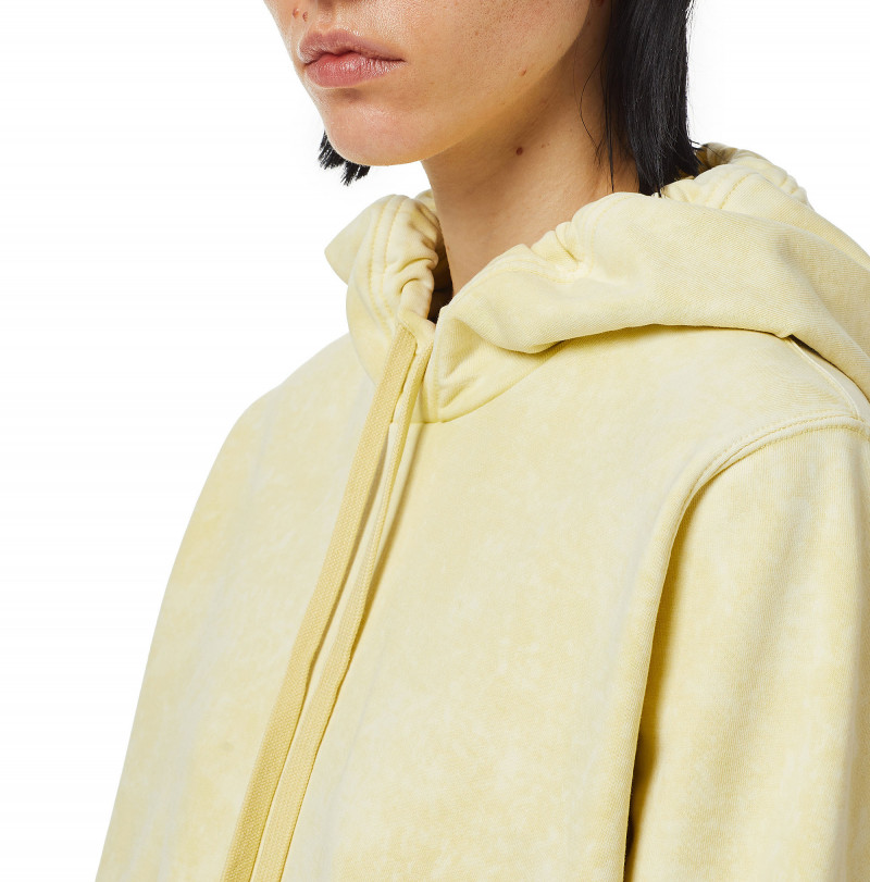 Női, márvány hatású melegítő. Regular, laza szabás. Kapucni húzózsinórral. A mandzsetták és a szegély bordázott kötéssel vannak díszítve. Finom hímzett "D"alakú logó a bal mandzsettán. Pasztellszínekkel festett, Garment - dyed módszerrel. A végső savas mosási folyamatot használták a gyönyörű márvány hatás elérése érdekében. A modell S-es méretet visel és 177 cm magas.