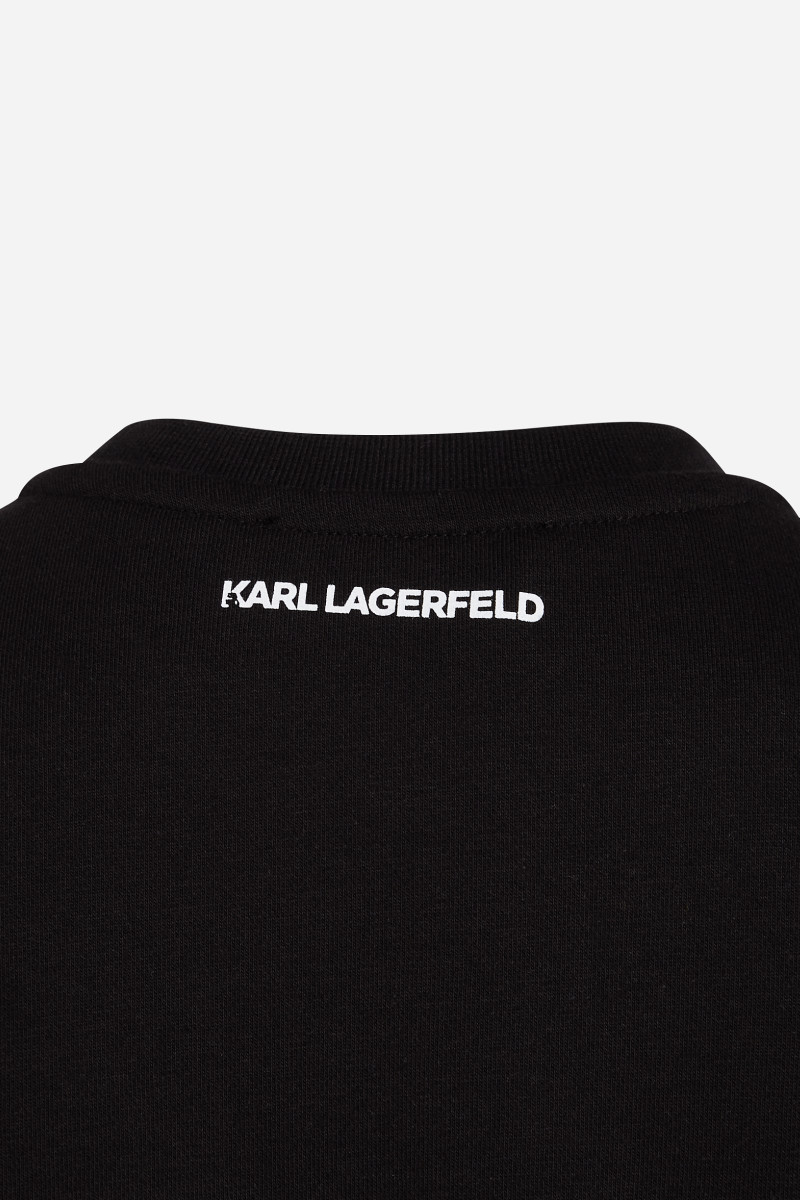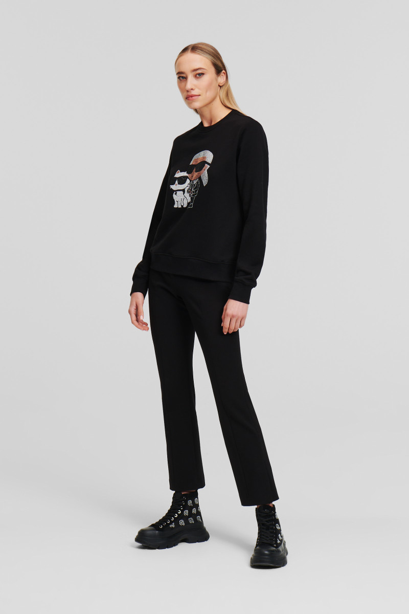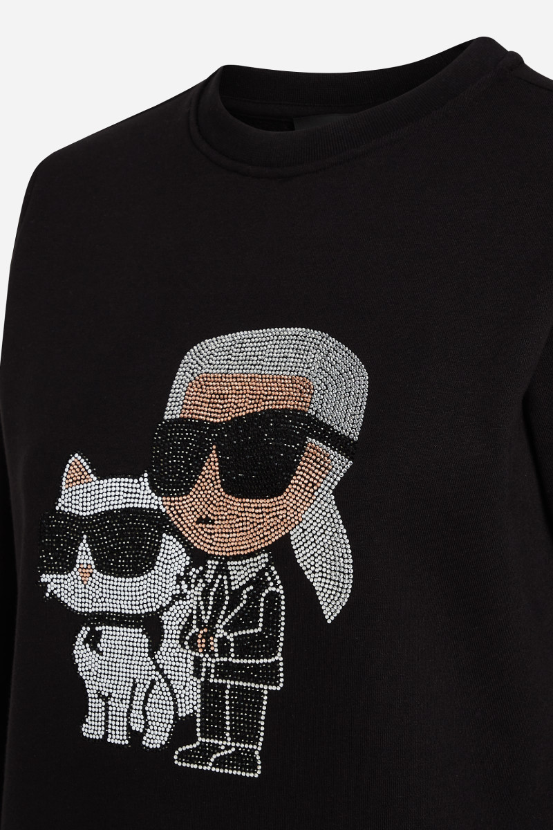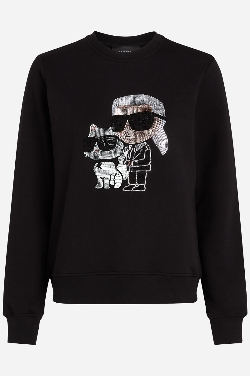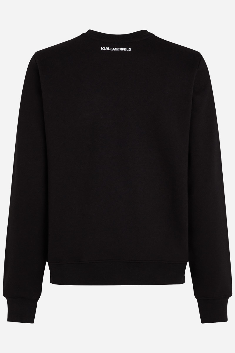 Kapucni nélküli női melegítő felső, amely kerek nyakkivágással van ellátva. Az egyszínű dizájnt Ikonik Karl-t és társát, Choupette-et ábrázoló, csillogó strasszkövekkel kirakott műalkotás díszíti. Az egyenes szabású darab praktikus, bordázott szegélyekkel van ellátva a derékon és az ujjakon. A kiváló minőségű anyag magas arányban tartalmaz prémium minőségű pamutszálat, amely kellemesen puha tapintású, légáteresztő, rugalmas és nagyon kényelmes viseletet biztosít. Ízléses alapdarabjává válik lezser öltözékének.