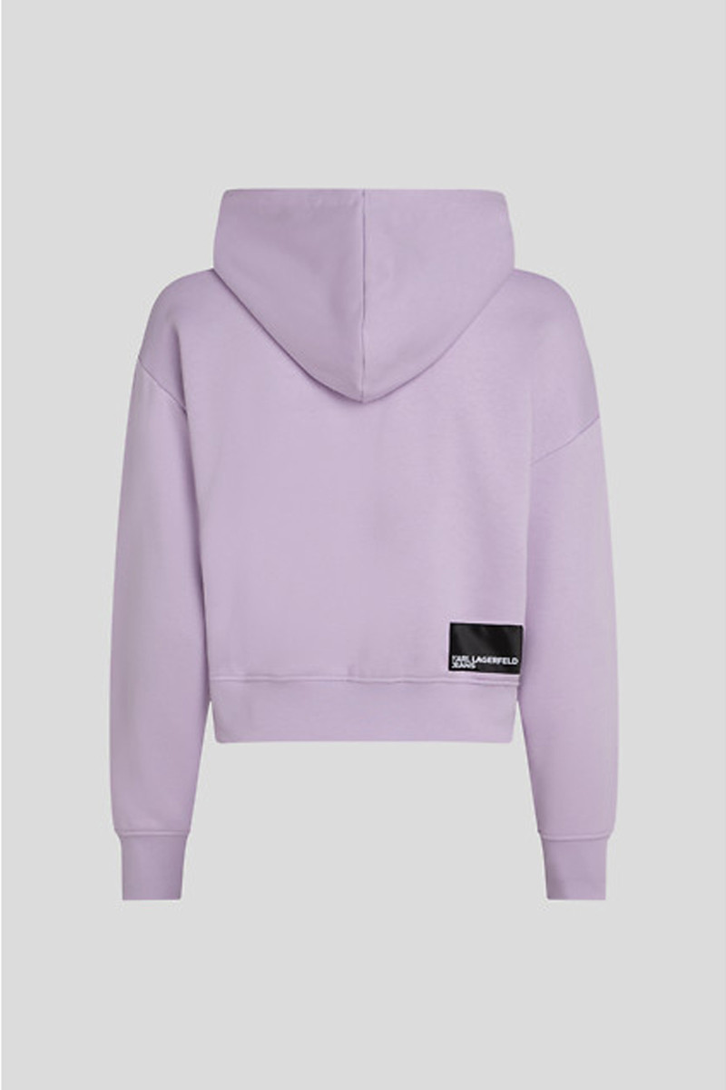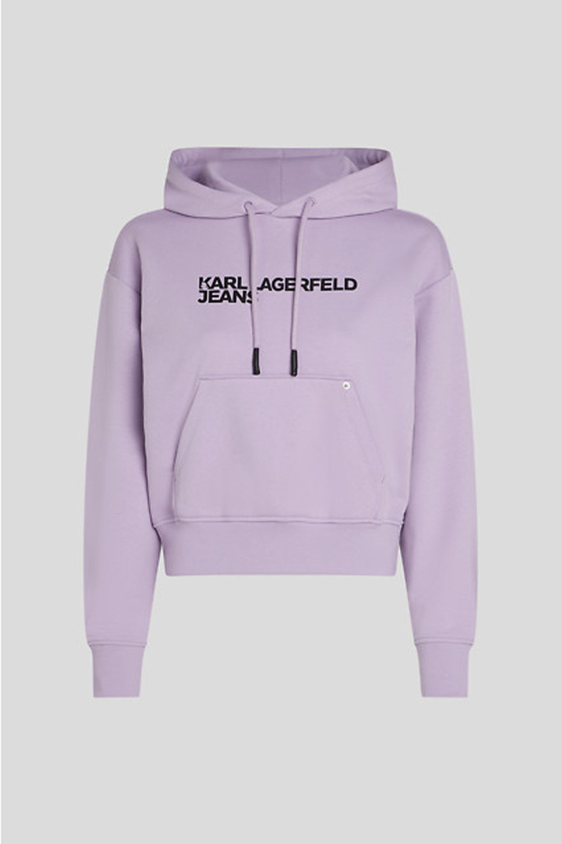 Női egyenes szabású pulóver kerek nyakkivágással és kapucnival, állítható zsinórokkal. A Karl Lagerfeld Jeans logója az elején és a hátán kontrasztos kivitelben látható. Az anyagösszetétel prémium minőségű organikus pamut szállal készült keverék, amely kellemesen puha tapintású, viselése során légáteresztő és rugalmassága, flexibilitása révén rendkívül kényelmes. A minőségi dzsörzé garantálja a forma- és színállóságot. Stílusos alap a szabadidős öltözködéshez.