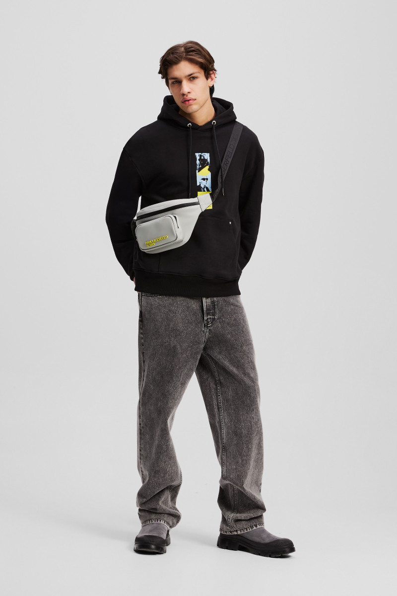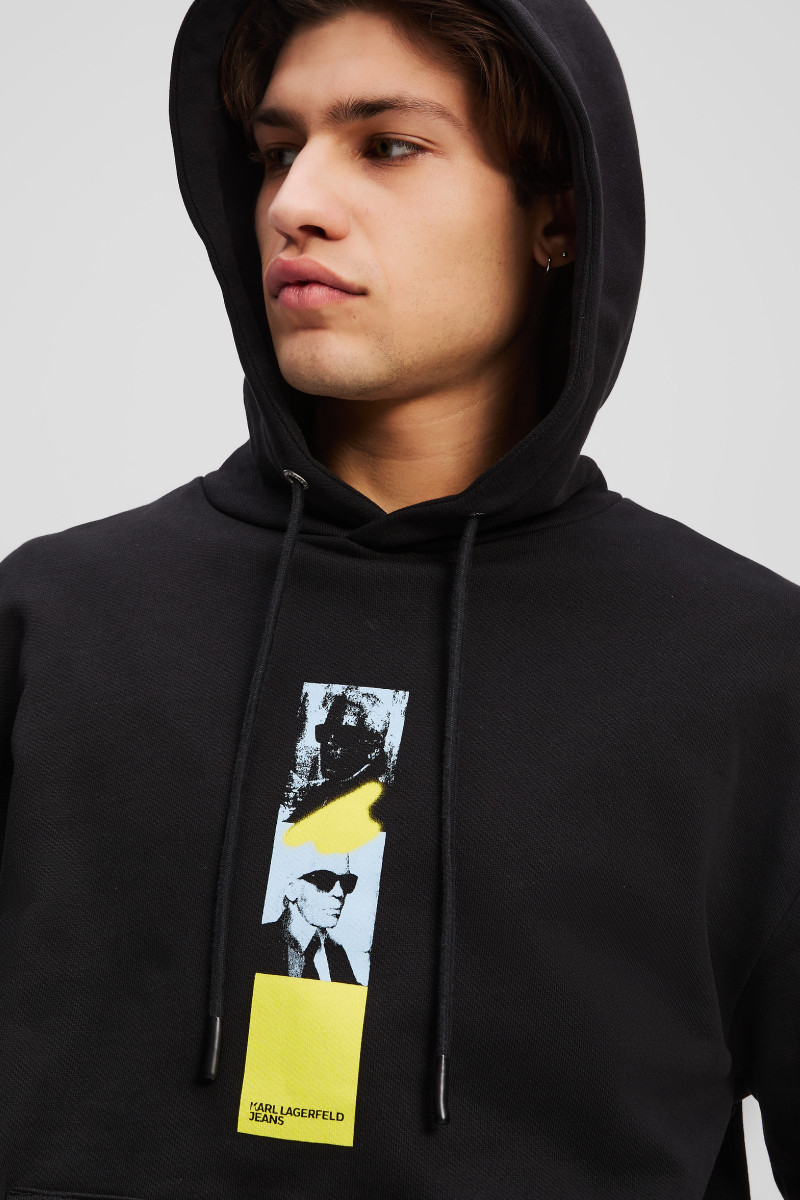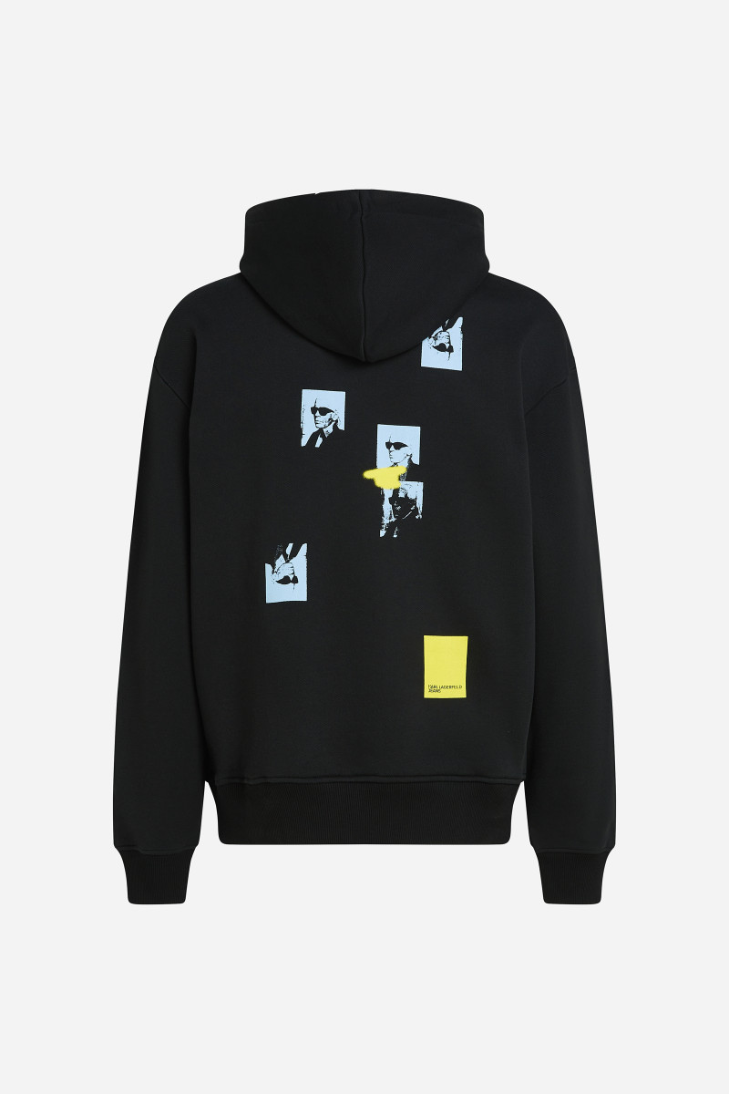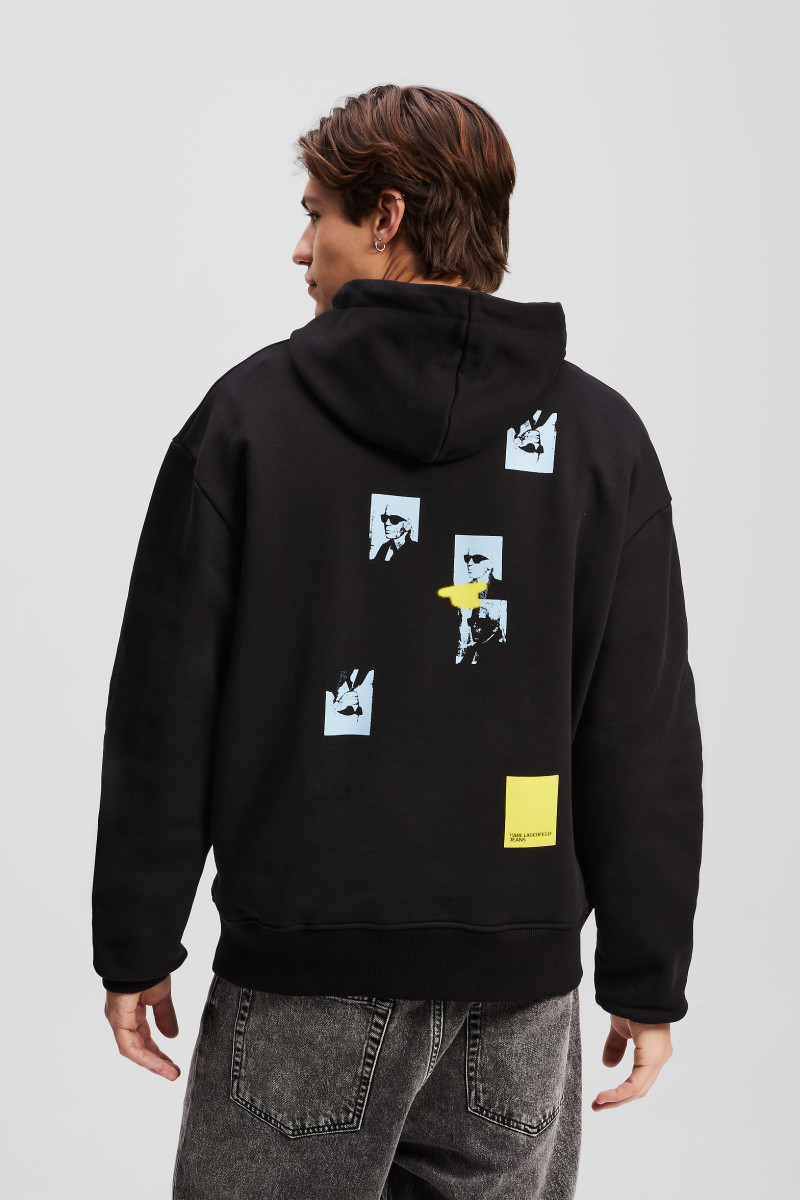 Férfi kapucnis pulóver, amelyet a deréknál és az ujjaknál praktikusan bordázott szegély zár le. Az elejét és a hátát Karl Lagerfeld ikonikus művészeti alkotása díszíti. A bársonyosan puha tapintású anyagösszetétel minőségi pamutszállal készült, ami kellemesen melegít, ugyanakkor tökéletesen lélegző. A prémium tulajdonságoknak köszönhetően a viselése során magas komfortérzet biztosított. Stílusos darab, amely nagyon kedvelt része lesz a szabadidős öltözékeidnek.