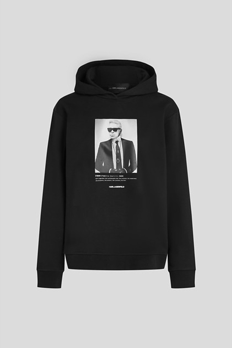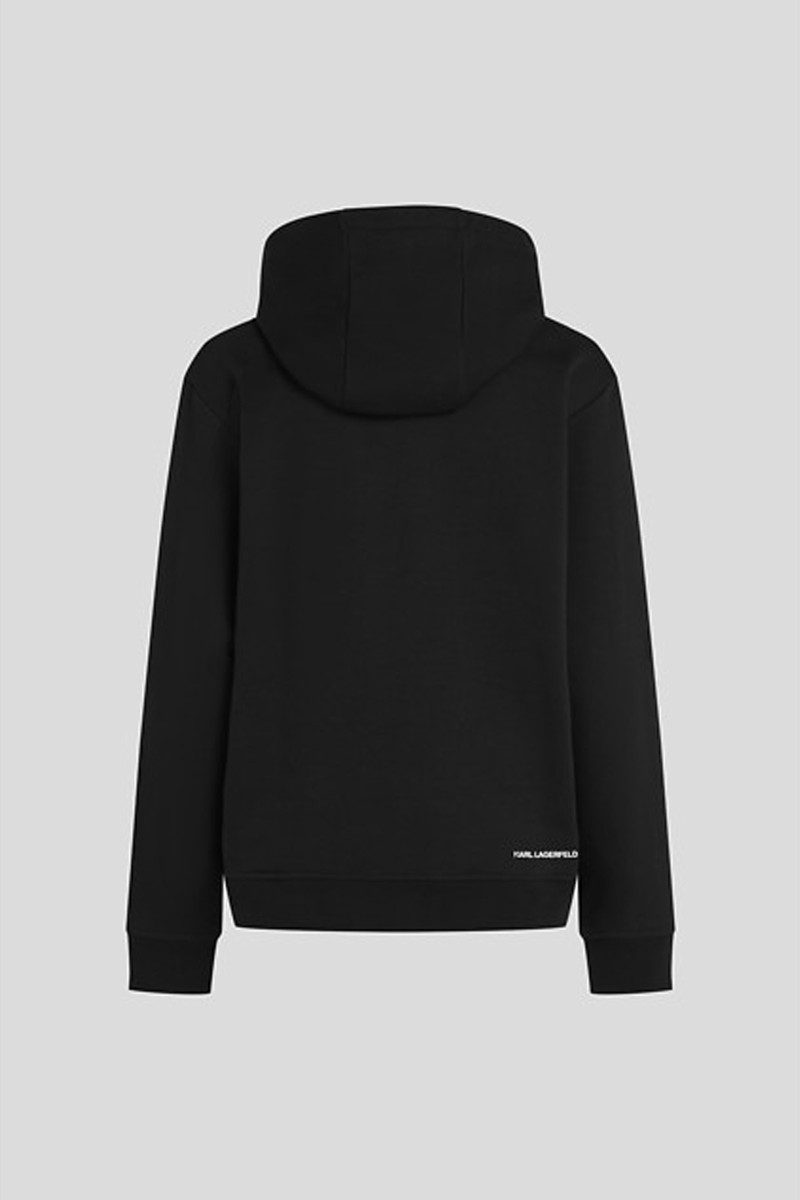 Női kapucnis pulóver. Egyenes szabású, a deréknál és az ujjaknál bordázott szegélyekkel, melyeket Karl Lagerfeld művészeti alkotásai és a kedvelt Choupette díszít a mellkason. Puha pamut kötésű anyag, amelynek könnyen kefélt hátoldala garantálja az egyedülállóan kényelmes viseletet. Nagyon praktikus és egyben kreatív darab, amely tökéletesen kiegészíti a laza öltözéket.