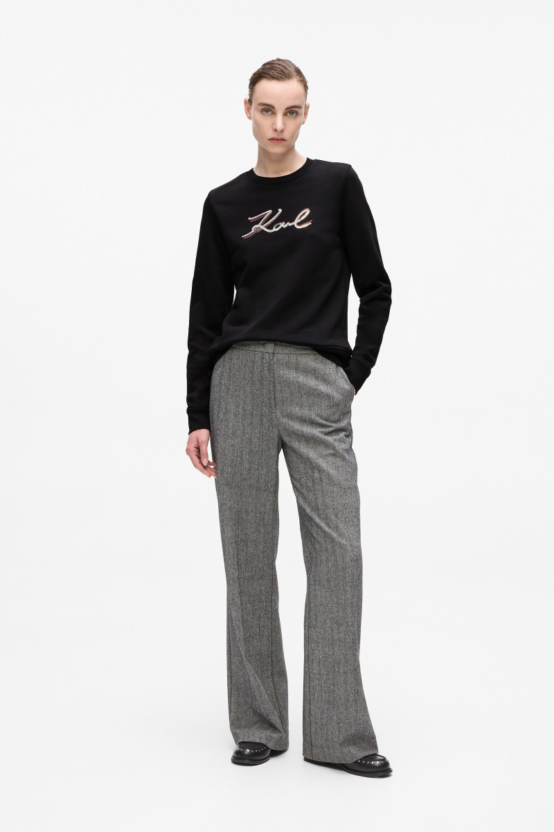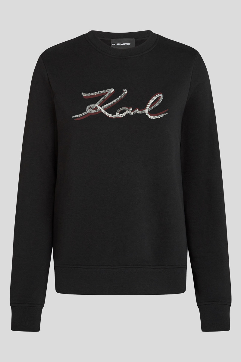 Női kapucnis pulóver kerek nyakkivágással. Egyszínű dizájnja a mellkason díszített flitteres Karl Signature logóval. A praktikus egyenes szabású alját és ujjait bordázott passzék zárják. A minőségi anyagösszetétel 100%-ban prémium pamutszálból áll, ami kellemesen puha tapintású, viselése közben lélegző, rugalmas és nagyon kényelmes. Stílusos alapja a szabadidős öltözékeket.