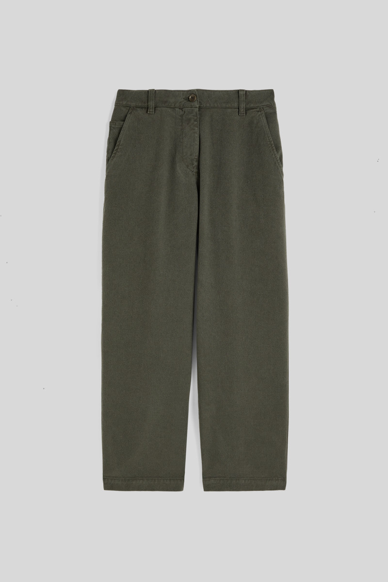 Női rövidített nadrág közepesen magas derekkal, pamutból és lyocell keperből készült, amely bársonyos hatást kelt. A szabás dartsokkal, széles, egyenes lábszárral rendelkezik, amely enyhén bővülő szegéllyel zárul. Elöl ferde zsebekkel, hátul pedig felvarrt zsebekkel ellátott. Ez a modell övbujtatókkal és rejtett cipzárral záródik. A hátulsó rész finoman kidolgozott üléssel díszített. Az anyagösszetétel tökéletes légáteresztő képességet, puhaságot és kényelmes viseletet biztosít. Nagyon praktikus és kényelmes darab modern szabással, amely tökéletesen kiegészíti az Ön öltözékét.