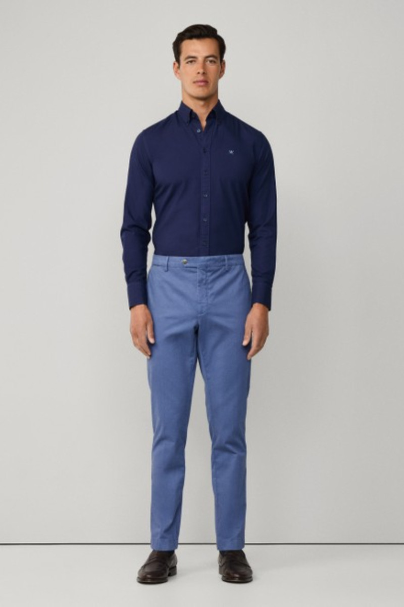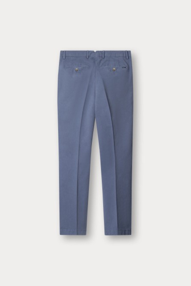 Vászonból készült férfi nadrág, amely szűk szabású szárakkal és klasszikus magasságú derékrésszel van ellátva. Remekül megmunkált varrással és elegáns záródással. Két oldalsó és két hátsó, gombos záródású zsebbel, valamint egy érmékre szolgáló zsebbel az elülső részen. Övhurkokkal ellátott. Anyaga tartós és tapintásra kellemesen puha szövetből készült, minőségi pamutszálból és a hozzáadott elasztánnak köszönhetően rugalmasságot biztosít és sokáig megőrzi majd eredeti alakját. Rendkívül előnyös, nagyon kényelmes darab, amely sokoldalú kombinálhatóságának köszönhetően lezser, ugyanakkor elegáns öltözékének kedvenc darabjává válik.