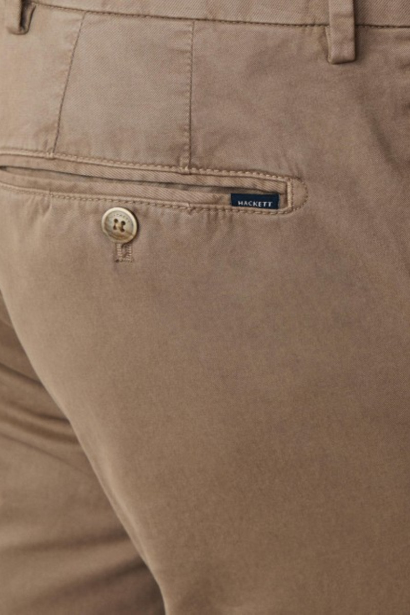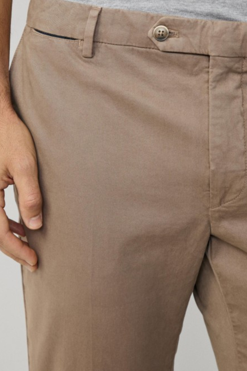 Vászonból készült férfi nadrág, amely szűk szabású szárakkal és klasszikus magasságú derékrésszel van ellátva. Remekül megmunkált varrással és elegáns záródással. Két oldalsó és két hátsó, gombos záródású zsebbel, valamint egy érmékre szolgáló zsebbel az elülső részen. Övhurkokkal ellátott. Anyaga tartós és tapintásra kellemesen puha szövetből készült, minőségi pamutszálból és a hozzáadott elasztánnak köszönhetően rugalmasságot biztosít és sokáig megőrzi majd eredeti alakját. Rendkívül előnyös, nagyon kényelmes darab, amely sokoldalú kombinálhatóságának köszönhetően lezser, ugyanakkor elegáns öltözékének kedvenc darabjává válik.