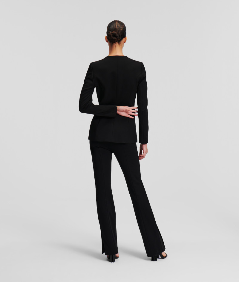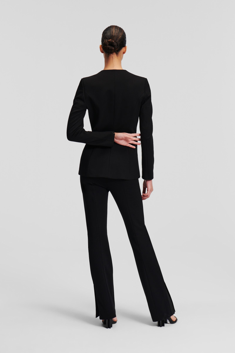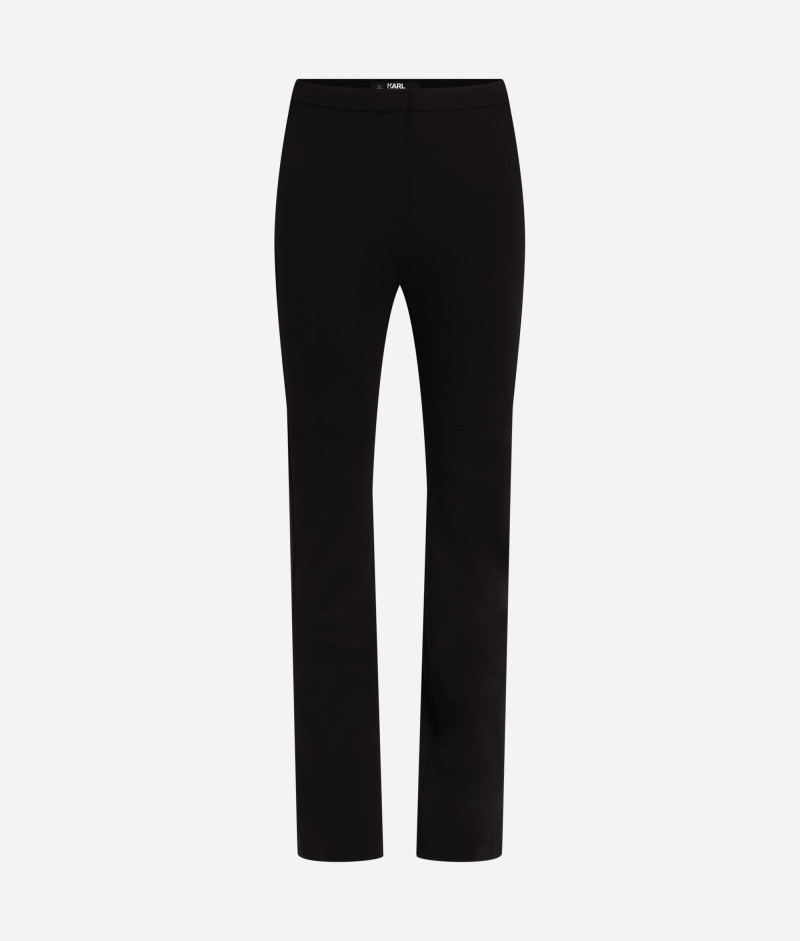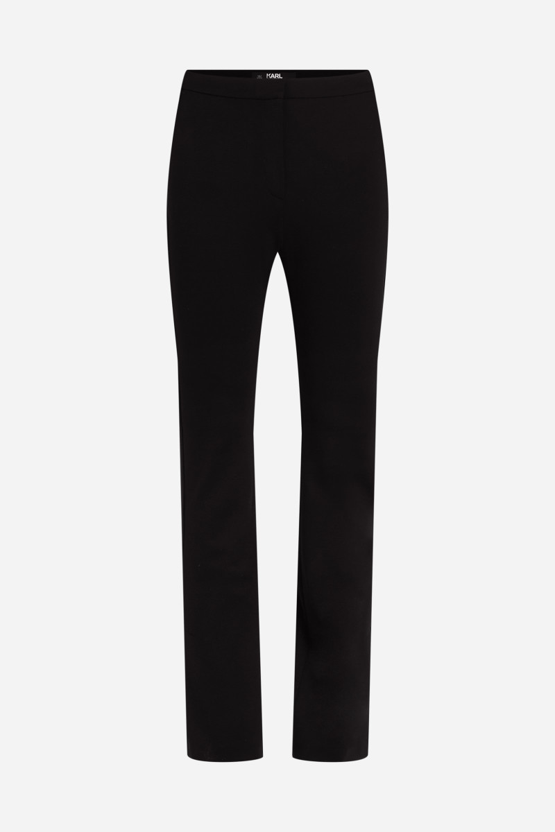 Női nadrág, amely rendkívül előnyös szabású. Sztreccs anyagból készült, melynek köszönhetően ez a darab kényelmet és mozgásszabadságot biztosít. A tonális Karl hímzés visszafogott, mégis ikonikus megjelenést kölcsönöz a darabnak, akárcsak az oldalsó felosztott szegély. A térdtől szélesedő szabás gyönyörű nőies sziluettet eredményez, amely minden testalkaton remekül mutat. Cipzáras és kapcsos rögzítéssel. Elegáns öltözéket érhet el, ha a nadrágot hozzá illő zakóval kombinálja.