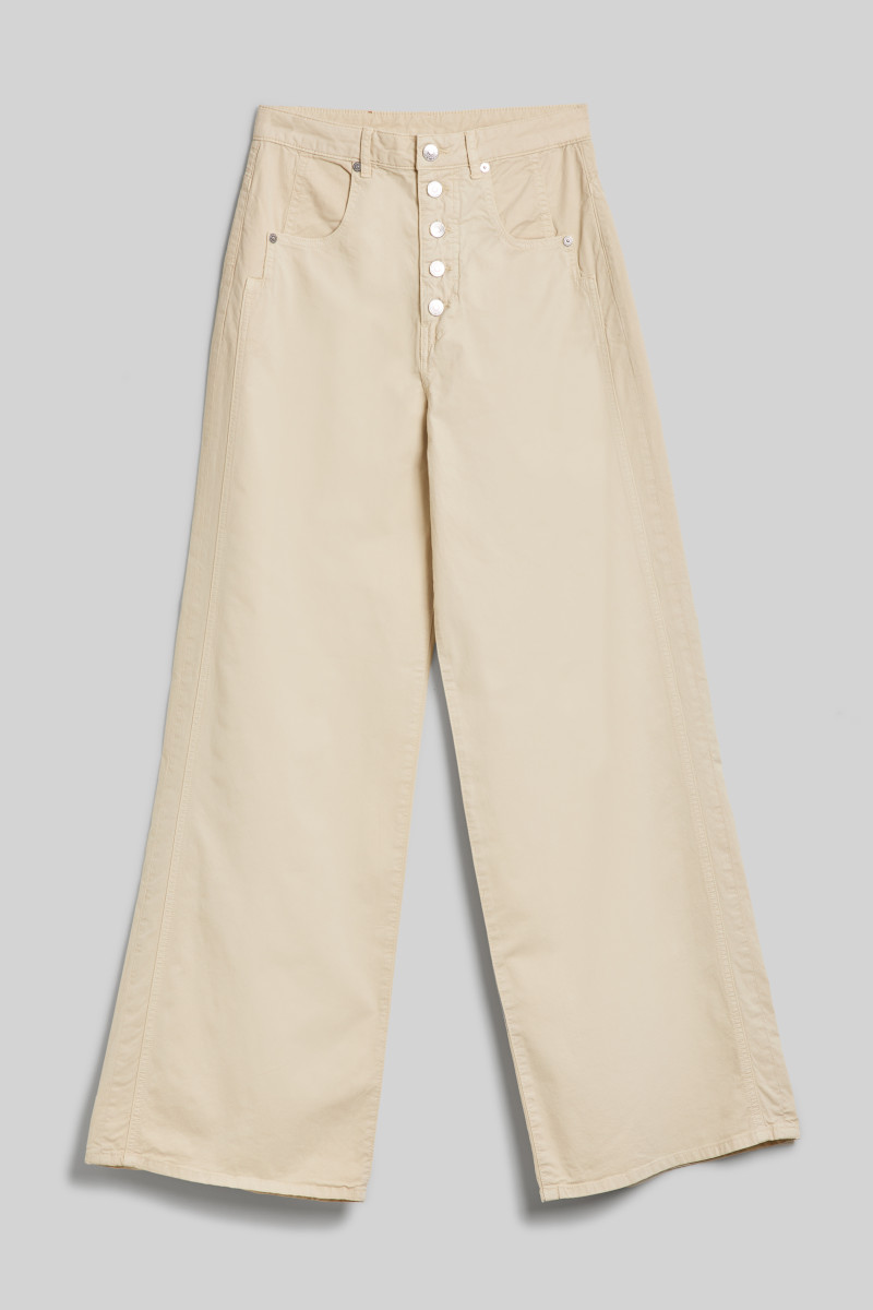 Modern női nadrág, amely szélesebb szárral és kissé magasabb üleppel van ellátva. Gombos rögzítéssel, amely összhangban van a zsebekkel és a nadrágon található rafinált varrással. Bőrből készült címkével a hátsó zseb felett, amelyen dombornyomott márkajelzés található. A stílusos megjelenésű, mégis sokoldalúan felhasználható darab anyaga kellemesen puha pamutszálból készült, hozzáadott elasztánnal, amely biztosítja, hogy az anyag rugalmas és kényelmes viseletet biztosít. Praktikus alapja a lezser, ugyanakkor elegáns öltözéknek, amelybe garantáltan beleszeret majd.