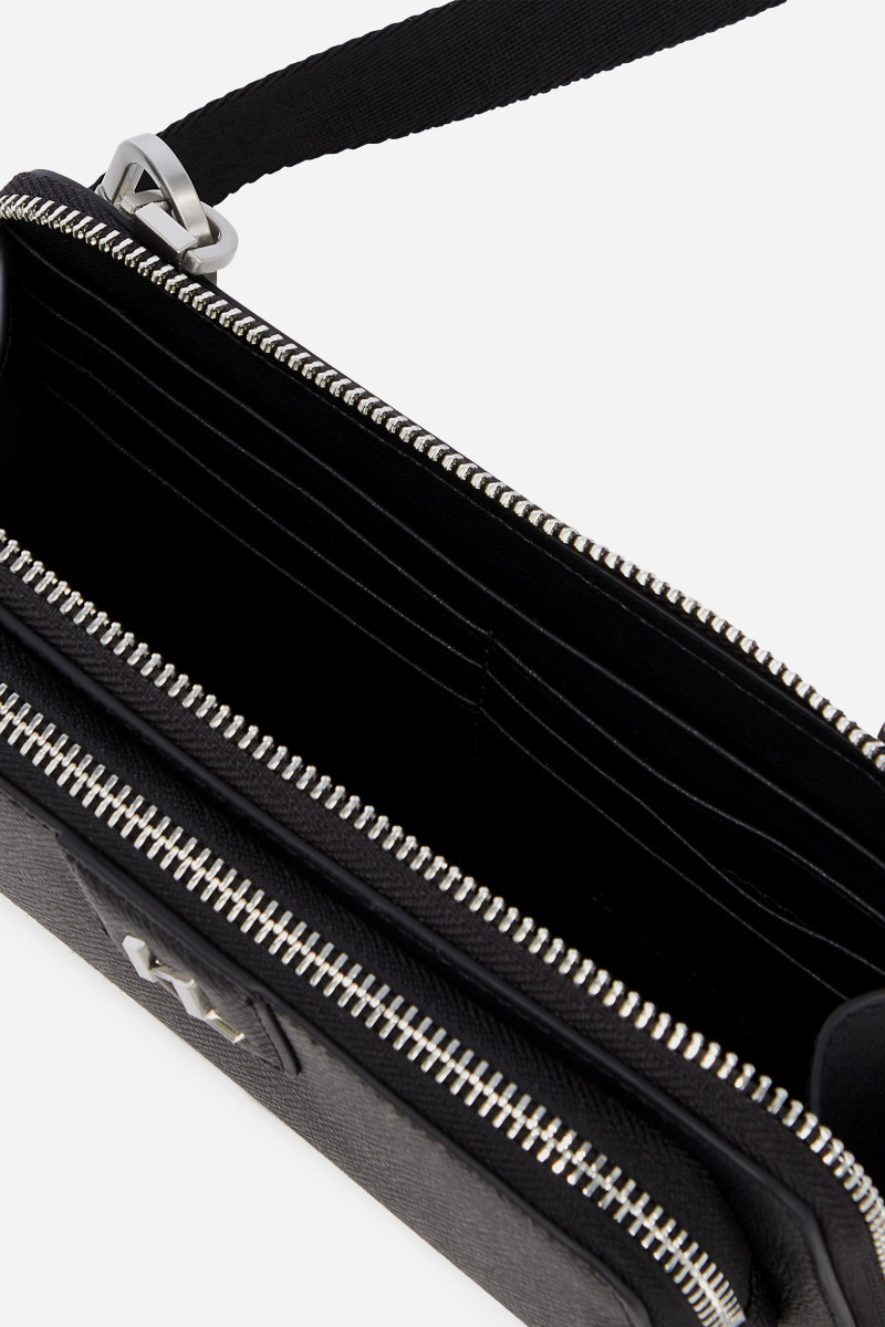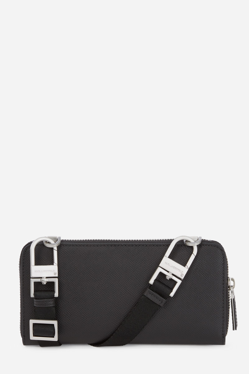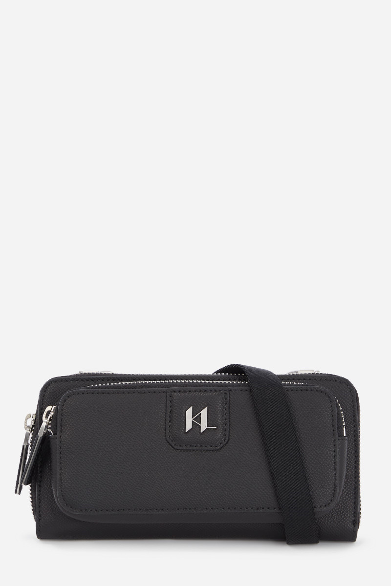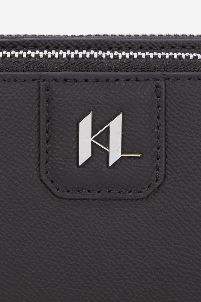 Praktikus bőr pénztárca. A fém cipzárral és lecsatolható keresztpánttal ellátott, elegáns kialakítású darabot a Karl Lagerfeld logó fém monogramja egészíti ki az elülső oldalon. Praktikus kialakítású, cipzárral záródó elülső zsebbel. A fő rekesz kártyarekeszekkel van ellátva. Felületi anyaga prémium minőségű, strukturált marhabőrből készült, amelyet kivételes szilárdság és tartósság jellemez, ugyanakkor azonban nem veszít luxus hatást keltő megjelenéséből.