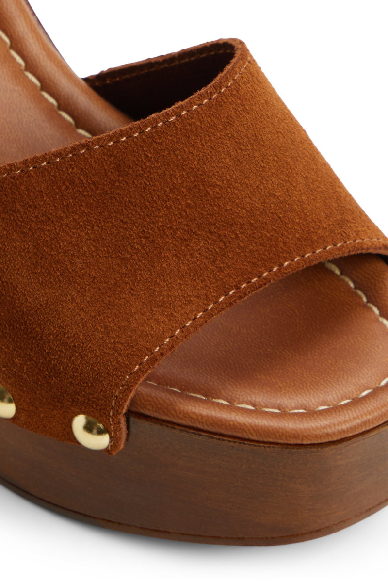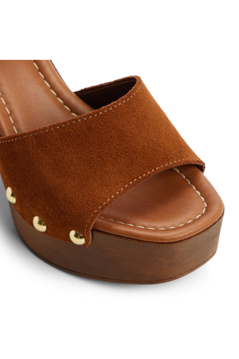Egy faragott fa platformon és merész tömbös sarokon nyugvó, ez a velúr szandál retro úti hangulatot áraszt, miközben az arany szögek a délutáni fényben kacsintanak, és a párnázott talpbetét minden lépést stabilan tart. Párosítsd trapéznadrággal a reggeli piacokra, vagy stílusosan viseld virágos minivel a tetőteraszos éjszakákhoz, ahogy a zene a csillagokba száll.