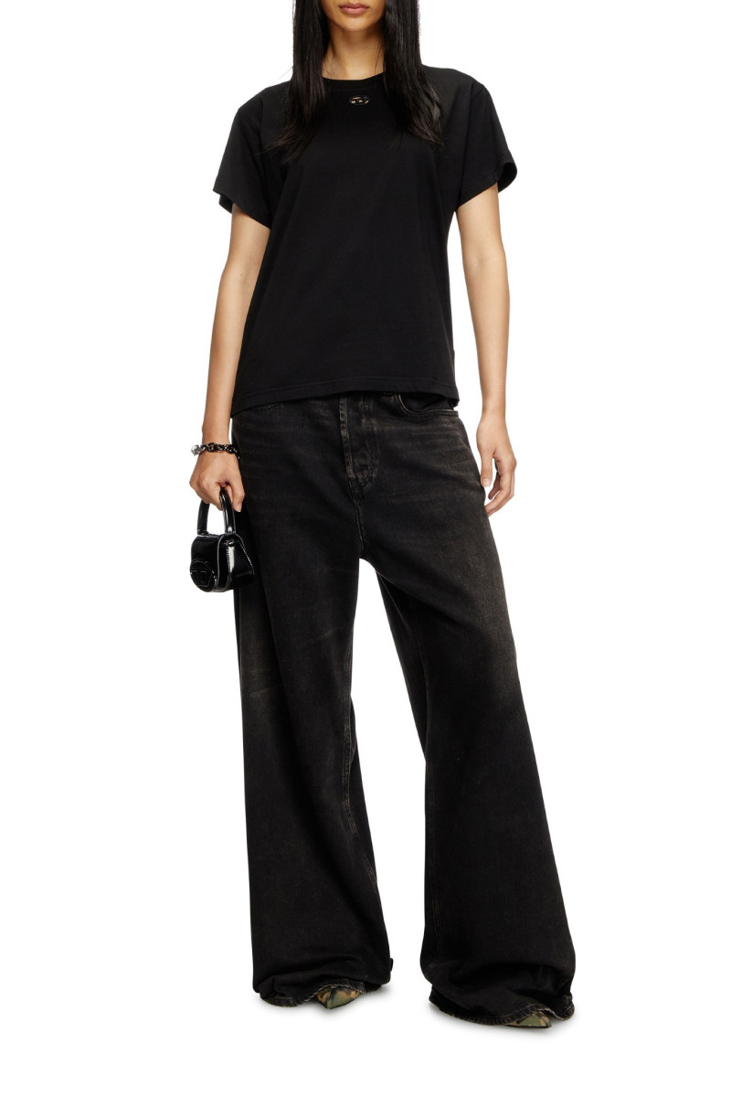 Női kerek nyakú, rövid ujjú póló. Kiváló minőségű organikus pamutból készült. Laza egyenes sziluett bordázott szegéllyel. A mellkas közepén kivágott kis ovális ikonikus D logó a márka jellegzetes stílusát erősíti. A modell S-es méretet visel és 175 cm magas. A méret a mérethez igazodik, kérjük, válassza a szokásos méretét a kiválasztáskor.