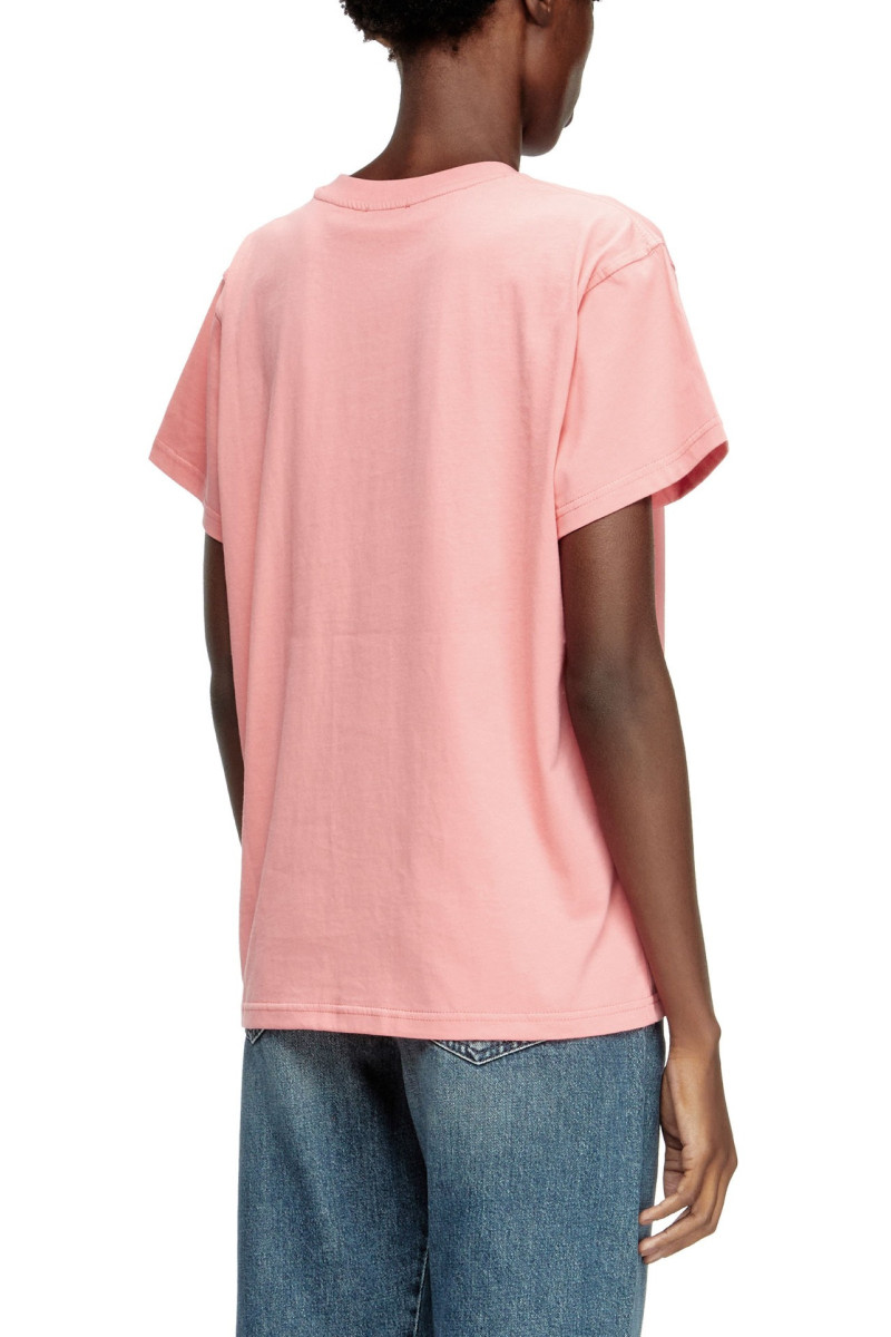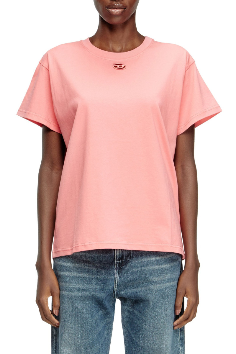 Női kerek nyakú, rövid ujjú póló. Kiváló minőségű organikus pamutból készült. Laza egyenes sziluett bordázott szegéllyel. A mellkas közepén kivágott kis ovális ikonikus D logó a márka jellegzetes stílusát erősíti. A modell S-es méretet visel és 175 cm magas. A méret a mérethez igazodik, kérjük, válassza a szokásos méretét a kiválasztáskor.