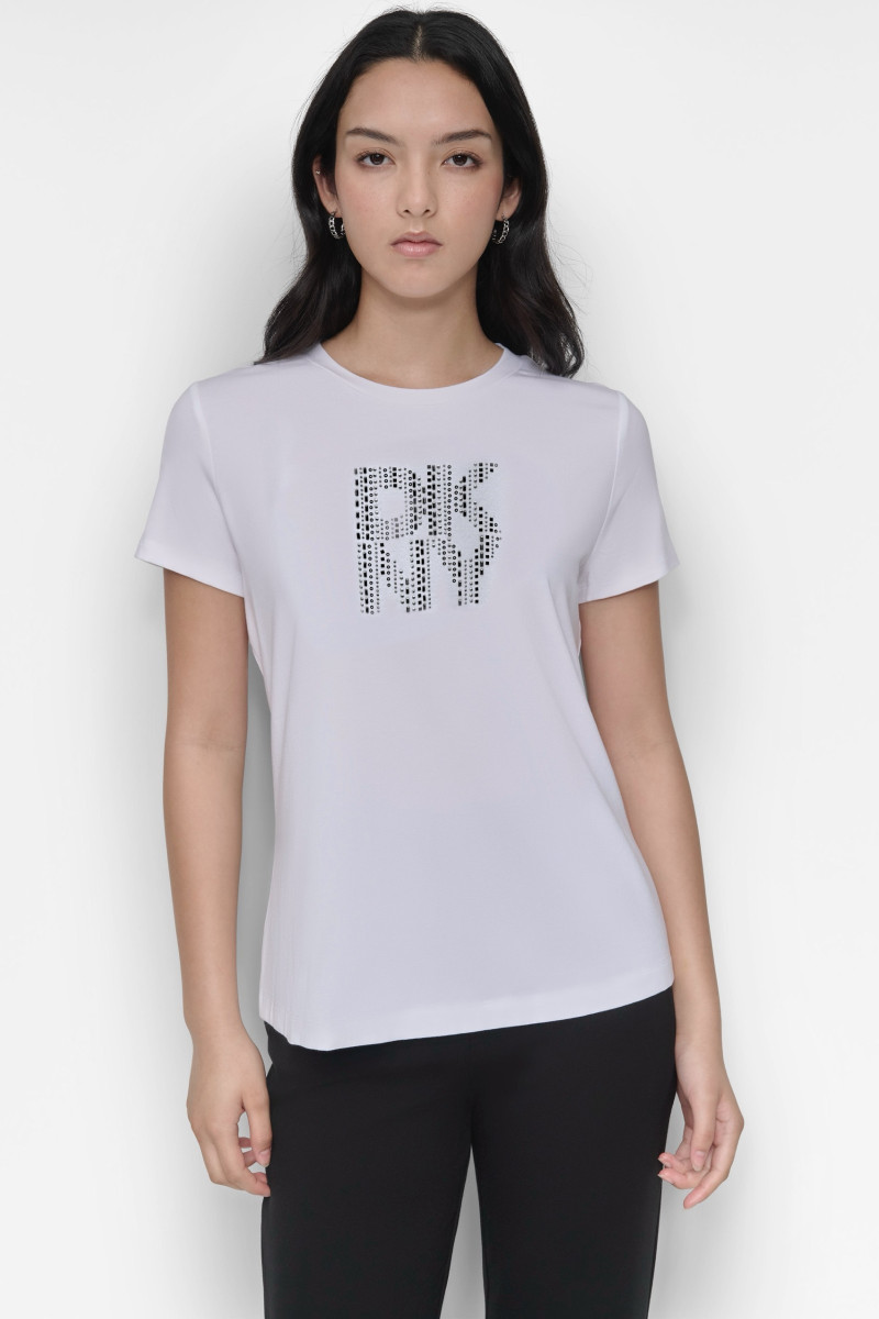 Női rövid ujjú póló. Az egyenes szabást kerek nyakú szegéllyel kiegészíti a mellkason található díszes DKNY strasszos logó. A magas százalékban prémium pamutból készült, rugalmas kötött anyag maximális légáteresztést, kellemes viseletet és könnyű ápolást biztosít. Remekül kombinálható és praktikus darab, amely stílusosan feldobja alkalmi ruhatáradat.