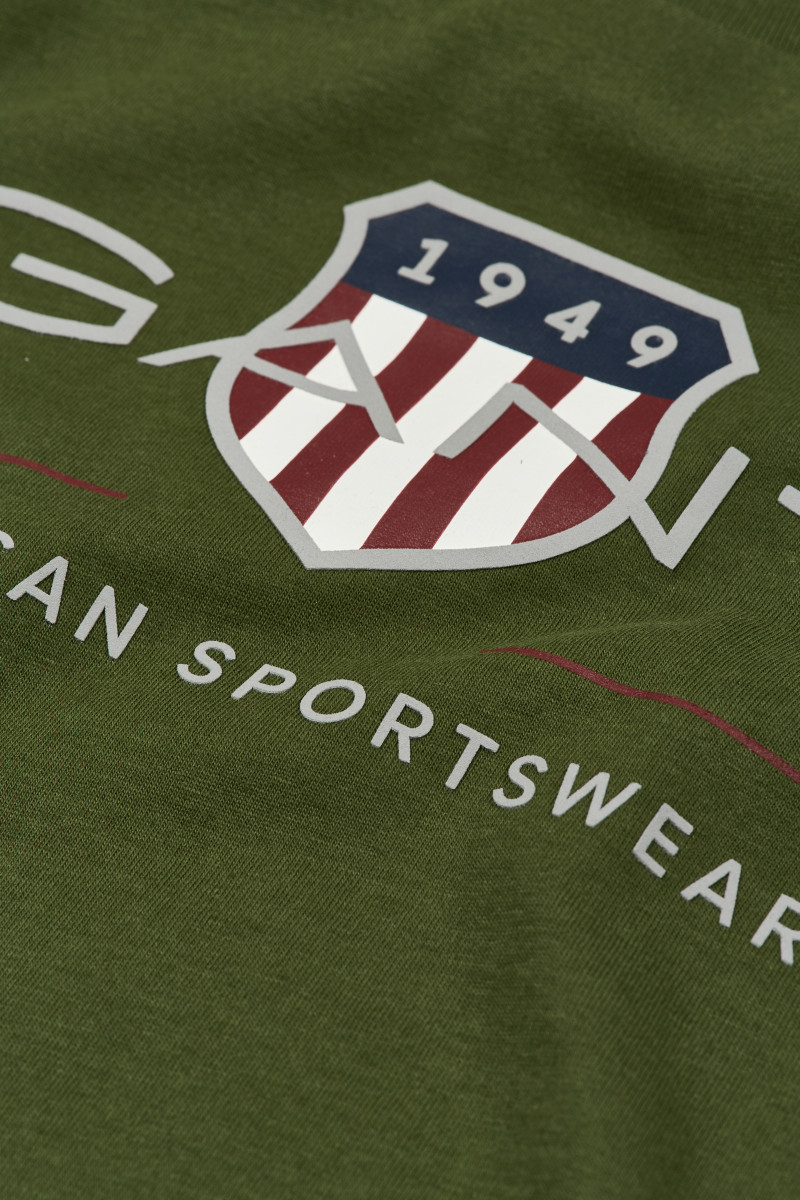 Egyenes szabású, organikus pamutszálból készült szabadidős gyermek póló. Kerek nyakkivágással, rövid ujjakkal. A mellkason domináns Gant logó és márkafelirat található, kontrasztos, aranyszínű szegéllyel. A könnyű és kellemesen puha, prémium minőségű jersey légáteresztő képességet és rendkívül kényelmes viseletet garantál viselés közben. Előnye az alacsony karbantartási igény, ennek ellenére azonban a darab hosszú ideig megőrzi eredeti alakját és színét. A sportruházat stílusos alapdarabja.
