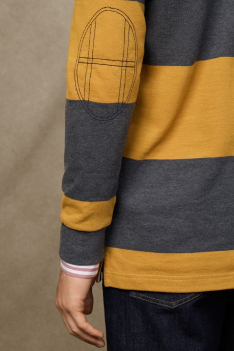 Hosszú ujjú férfi rugger, amely egyenes szabású. A kellemesen puha tapintású jersey-t csíkos minta díszíti és a mellkasán, valamint hátoldalán hímzett márkajelzés található. Az darab exkluzív megjelenését tovább fokozza az elegáns aláfestésű záróvonal, amely összhangban van a mellkason található applikációkkal. A könyökrésznél mutatós elemmel, valamint hátsó oldalán akasztóhurokkal. Anyaga minőségi pamutszálból készült, így melegen tart, ugyanakkor rendkívüli légáteresztő képességet biztosít. Nagyon kényelmes darab, amely elengedhetetlen részévé válik lezser, ugyanakkor elegáns öltözékének.