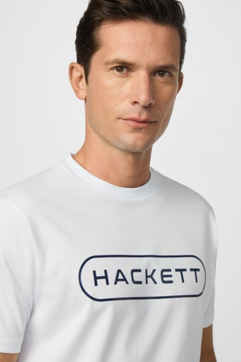 Férfi póló, amely egyenes szabású és rövid ujjakkal, valamint kerek nyakkivágással van ellátva. Ikonikus Hackett Sport logóval, valamint lapos, gumírozott nyomattal a mellkason. Anyaga prémium minőségű pamutszálból készült, így kellemesen puha tapintású, légáteresztő és rendkívül kényelmes viseletet biztosít. A minőségi jersey egyedülálló rugalmasságot garantál, így sokáig megőrzi majd eredeti alakját. Szabadidős darab, amely ízléses részévé válik a mindennapok öltözékének.