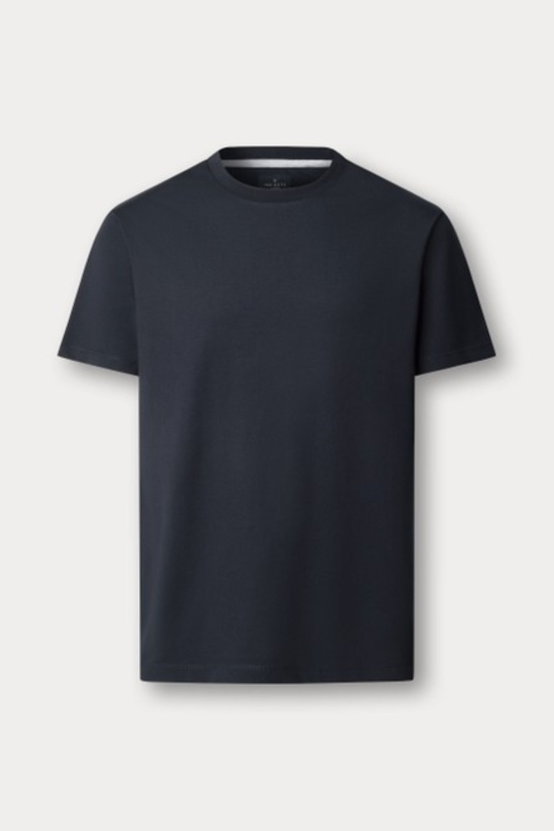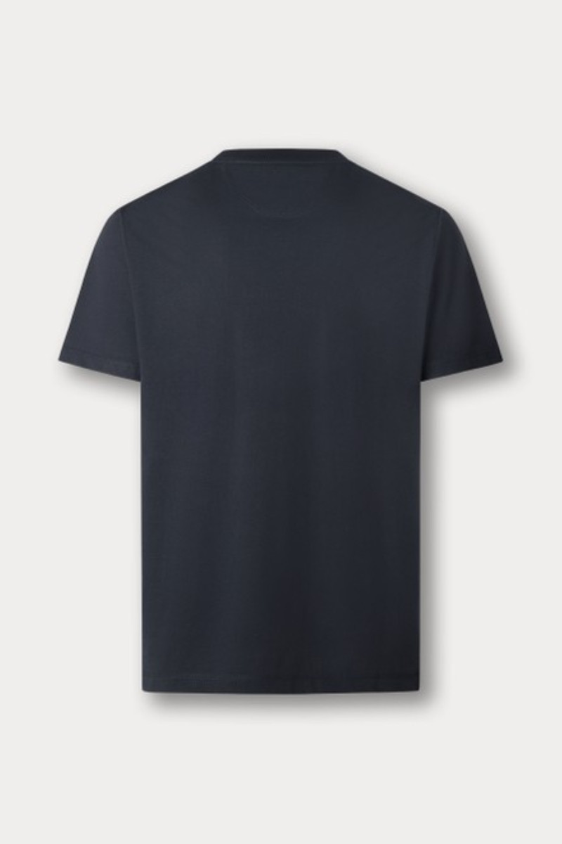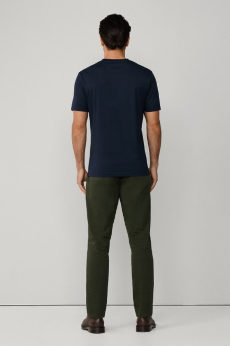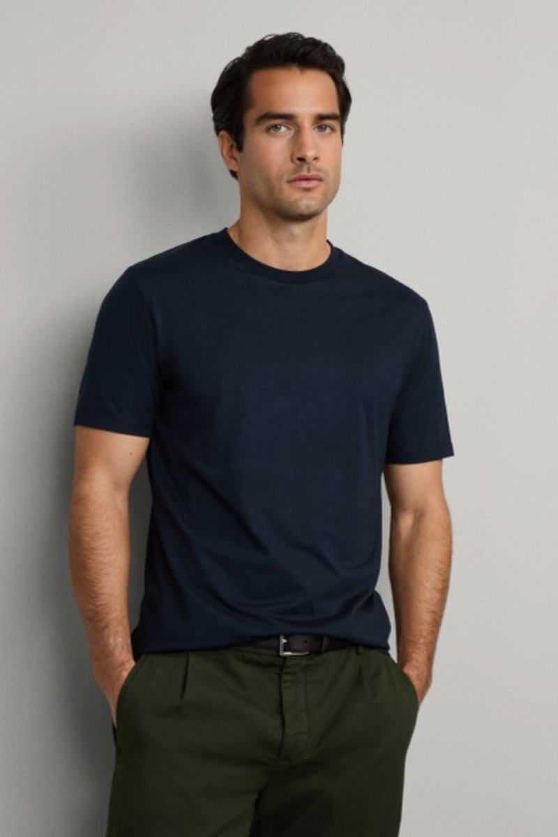 Férfi póló, amely egyenes szabású és rövid ujjakkal van ellátva. Kerek, bordázott nyakkivágással és diszkrét, hímzett logóval, amely tonális kivitelezésű. Anyaga sima, elegáns fényű jersey-ből készült és a prémium minőségű pamutszálnak köszönhetően luxus hatást kelt. A minőségi, kellemesen puha kötött anyag ellenálló és tökéletes légáteresztő képességet garantál. Egyedi szabadidős darab, amely ízléses részévé válik a mindennapok öltözékének.