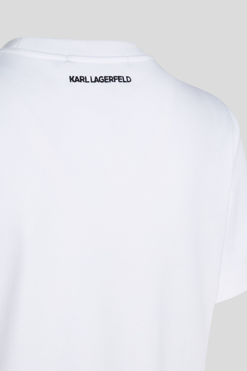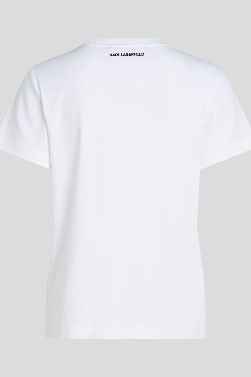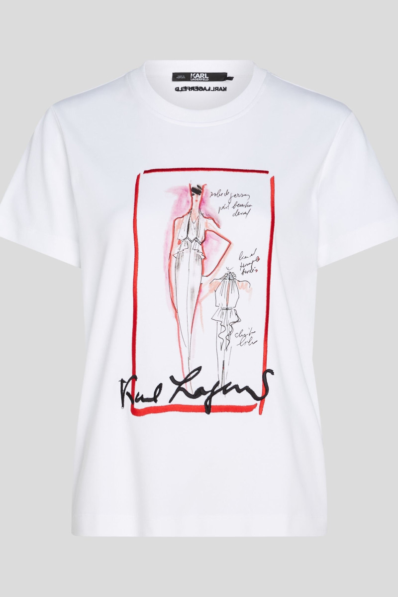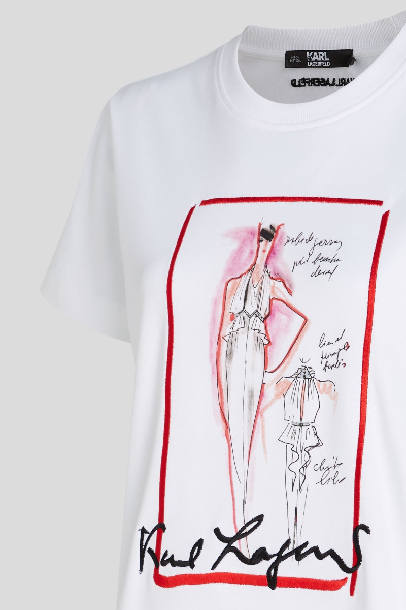 Női egyenes szabású póló rövid ujjakkal és kerek nyakkivágással. Karl Lagerfeld eredeti vázlatai által inspirált művészeti alkotásokkal díszített, és bepillantást enged a divattörténelembe. Anyagösszetétele 100% prémium minőségű organikus pamutszálból készült, amely kellemesen puha tapintású, viselése során lélegző és nagyon kényelmes a rugalmasságának és rugalmasságának köszönhetően. A kiváló minőségű jersey garantálja a forma- és színtartóságot. Stílusos alap a szabadidős stílushoz.