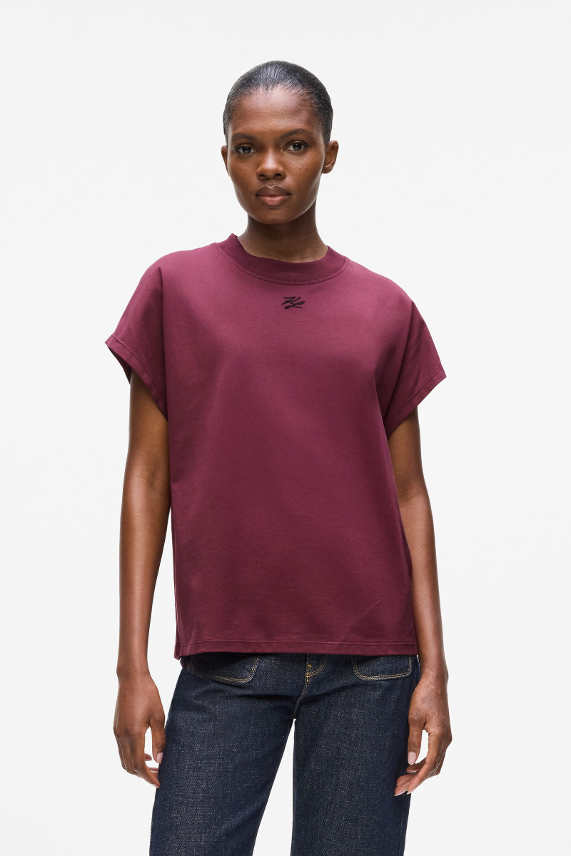 Női póló laza, egyenes szabással, rövid ujjal és kerek nyakkivágással. A mellkason kontrasztos, hímzett Karl Autograph logóval díszített. Anyagösszetétele 100% organikus pamutból készült prémium minőségű szál, amely kellemesen puha tapintású, viselése során légáteresztő, és rugalmasságának, valamint flexibilitásának köszönhetően rendkívül kényelmes. A minőségi dzsörzé forma- és színállóságot garantál. Stílusos alapja a szabadidős öltözködésnek.