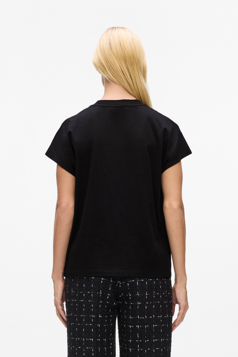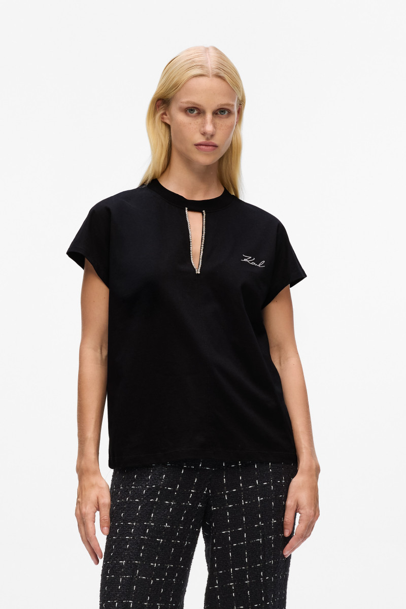 Női egyenes szabású póló rövid ujjakkal és kerek nyakkivágással. A nyakkivágásnál strasszokkal díszített designnal és a mellkason elhelyezett Karl Signature logóval. Az anyagösszetétel 100%-ban prémium minőségű, organikus pamutból áll, amely kellemesen puha tapintású, viselése légáteresztő, és rugalmassága, valamint flexibilitása révén rendkívül kényelmes. A minőségi jersey anyag formai és színállóságot garantál. Stílusos alapdarab a szabadidős öltözködéshez.