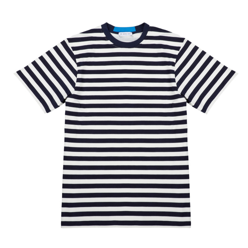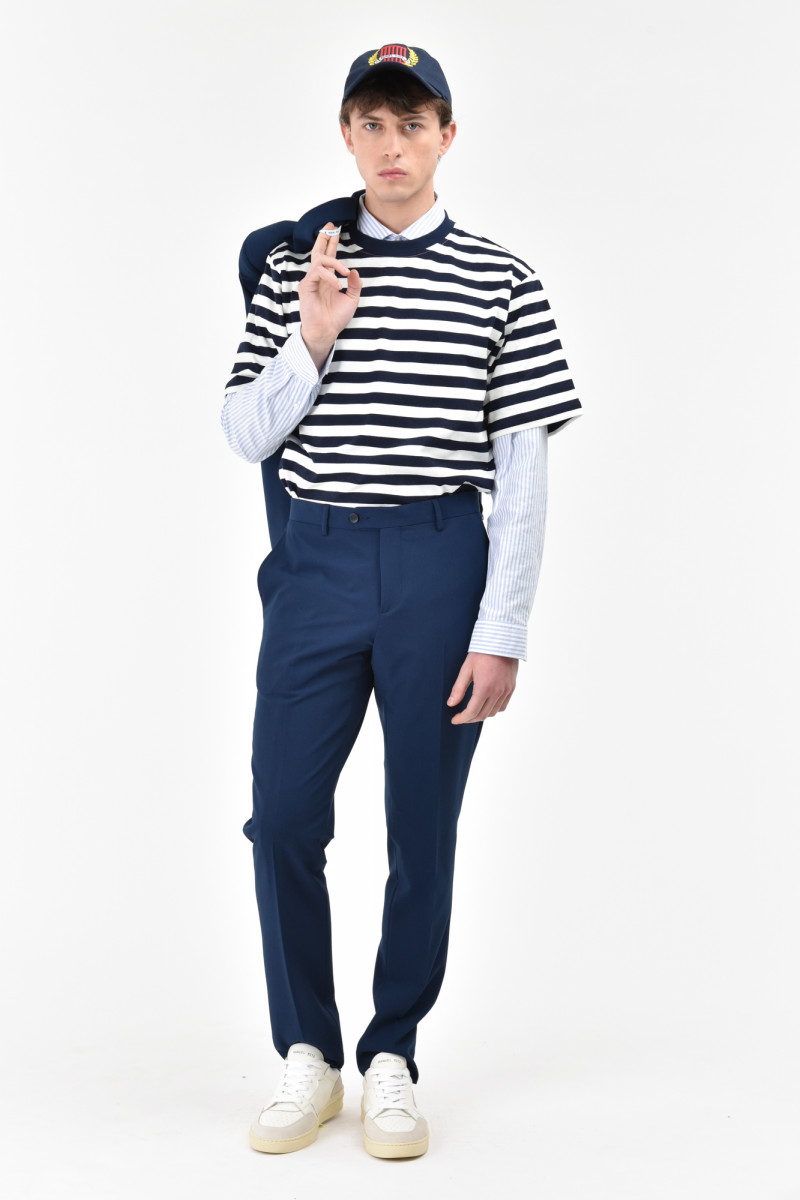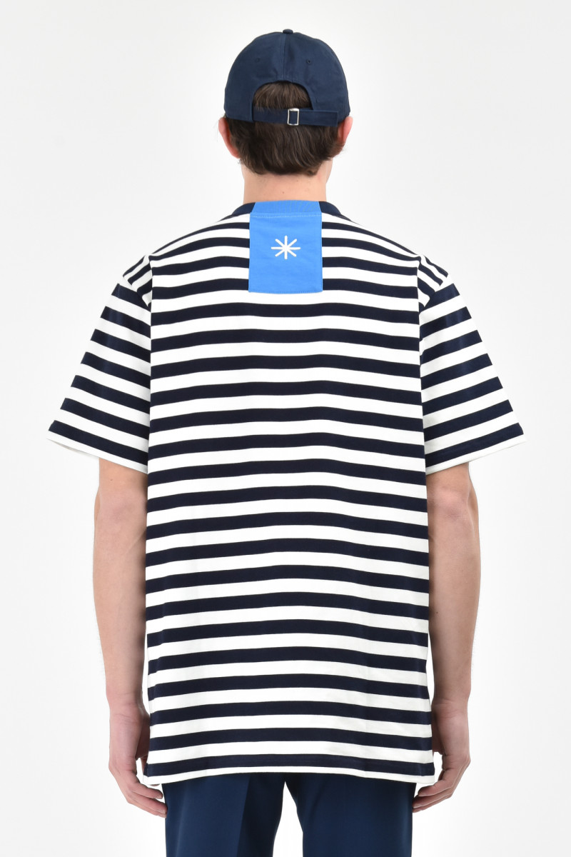 Férfi, csíkos, rövid ujjú, normál szabású póló a Manuel Ritz kollekcióból. Kerek nyakkivágás bordázott elasztikus résszel, hátul kontrasztos varrott részletekkel és márkajelzéssel (csillag). A 100% pamutból készült magasabb súlyú prémium anyagösszetétel kellemesen puha tapintású, tökéletesen lélegző és rendkívül kényelmes viselet. Egy klasszikus darab modern változata, amely tökéletesen kiegészíti a mindennapi öltözéket rövidnadrággal vagy farmernadrággal és sportcipővel.
