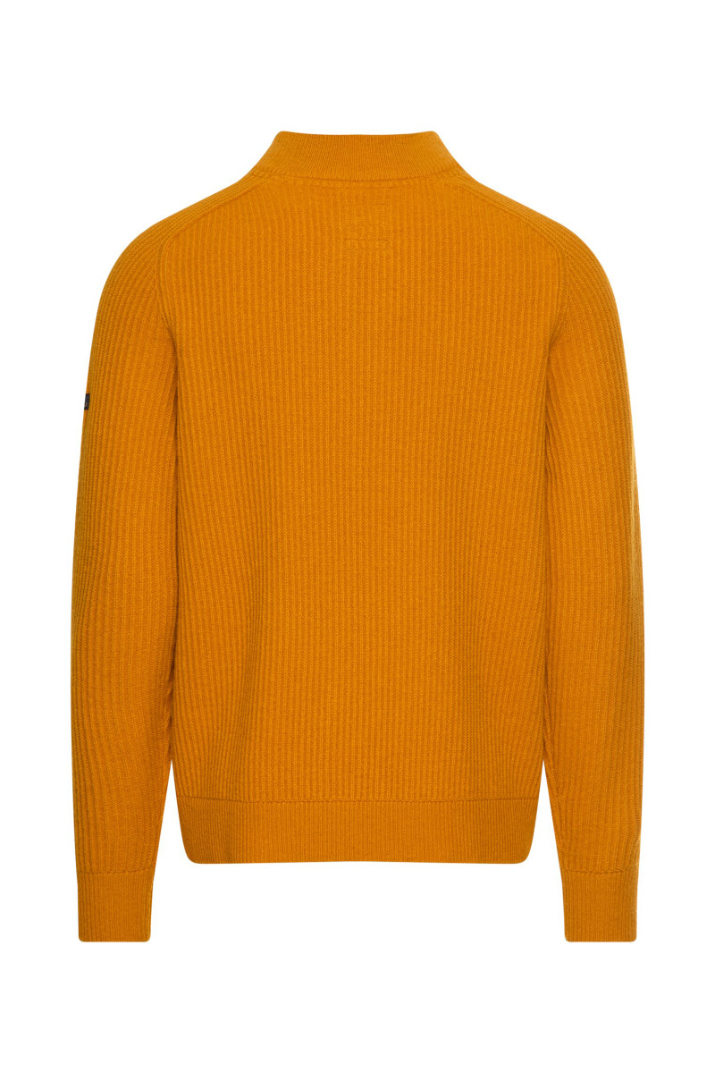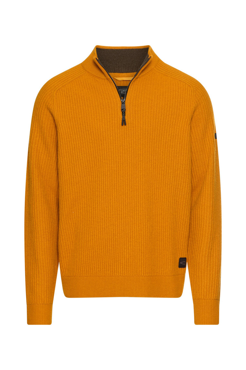 Gyapjúból készült férfi pulóver, amely állógallérban végződő félcipzárral van ellátva és bordázott mintázatú. Az egyenes szabású darabot elasztikus szegélyek zárják a derékon és az ujjakon. A viselési kényelem a kötött anyag rugalmasságának köszönhetően magától értetődő. Mellénnyel kombinálva stílusos, sportos és lezser öltözéket hozhat létre, amely melegen tartja majd és remekül mutat a téli hónapok során.