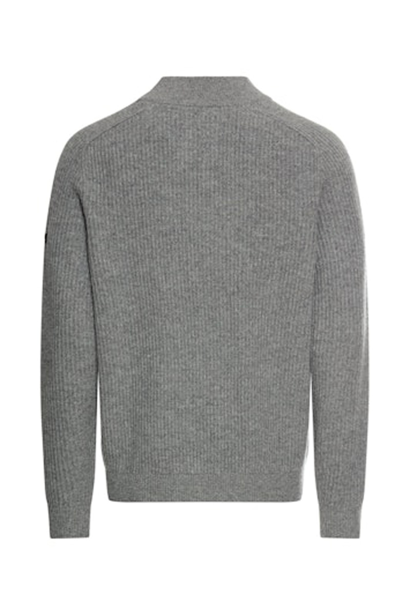 Gyapjúból készült férfi pulóver, amely állógallérban végződő félcipzárral van ellátva és bordázott mintázatú. Az egyenes szabású darabot elasztikus szegélyek zárják a derékon és az ujjakon. A viselési kényelem a kötött anyag rugalmasságának köszönhetően magától értetődő. Mellénnyel kombinálva stílusos, sportos és lezser öltözéket hozhat létre, amely melegen tartja majd és remekül mutat a téli hónapok során.