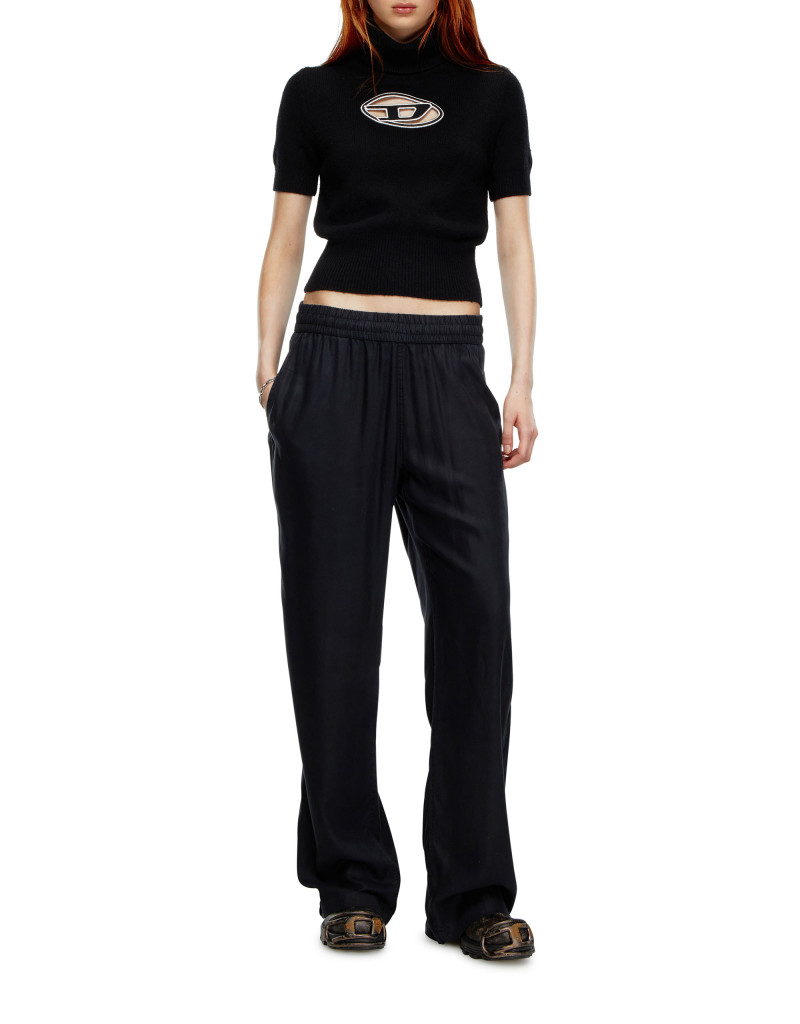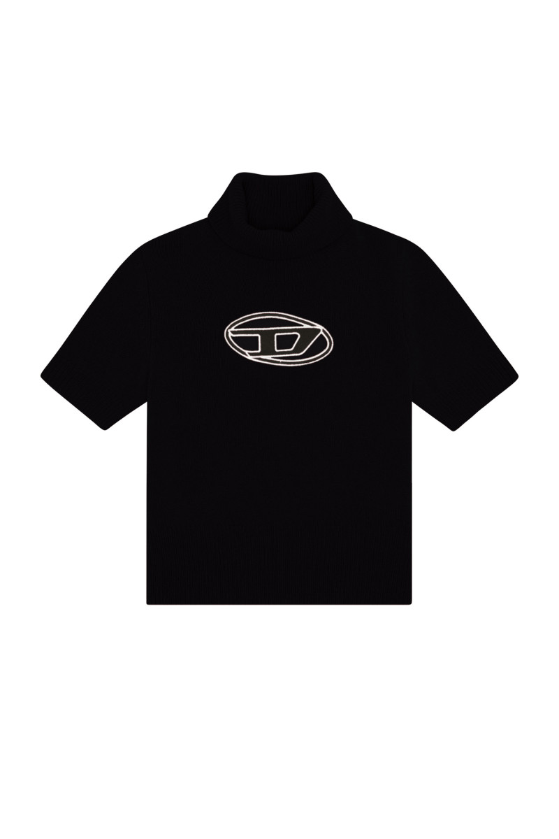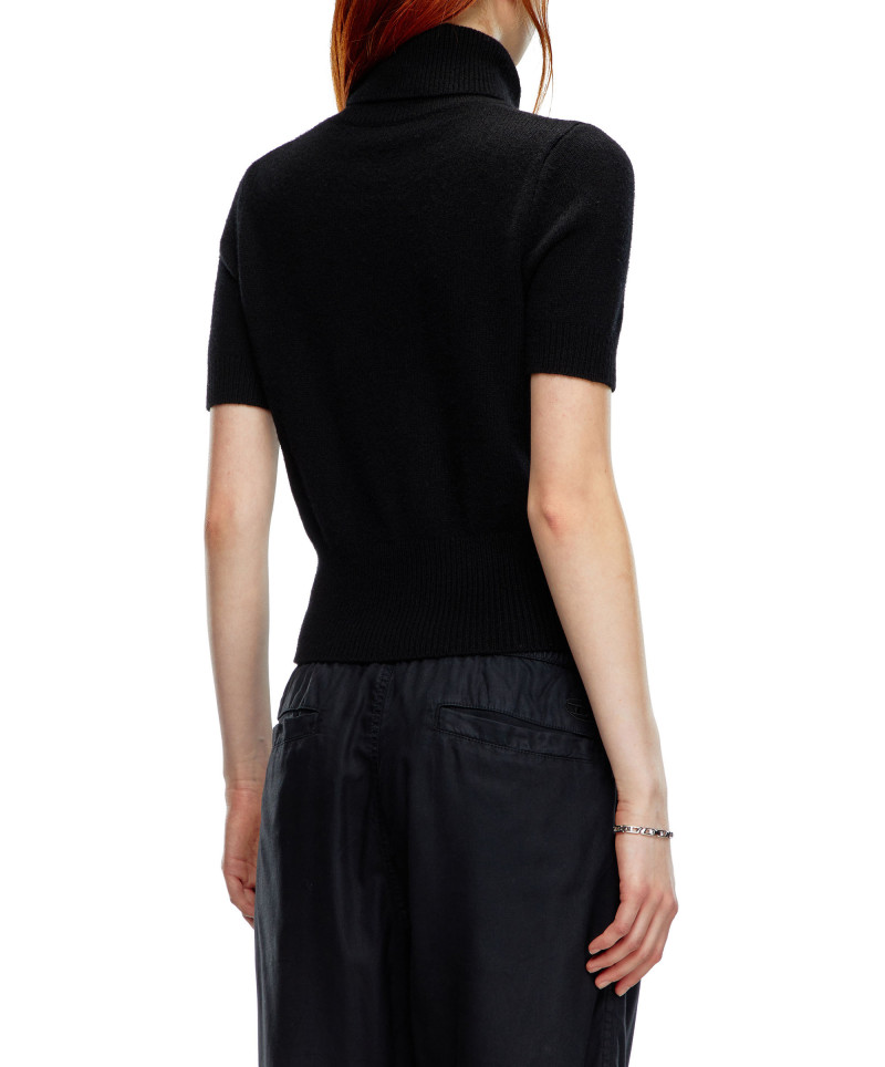Női rövid ujjú, garbó nyakú pulóver, amely elülső részén jellegzetes részlettel van ellátva. Újrahasznosított kasmír és gyapjú puha keverékéből készült, amely puhává és gyengéddé varázsolja a pulóvert, valamint kellemesen melegen tart. Az ujjak és a derékrész bordázott szegéllyel vannak ellátva. A mellkason található kivágáson egy ovális D logót találunk, amely tonális fonallal hímzett, így a darab eredeti hatást kelt. A pulóver garantáltan egyedivé varázsolja öltözékét.
