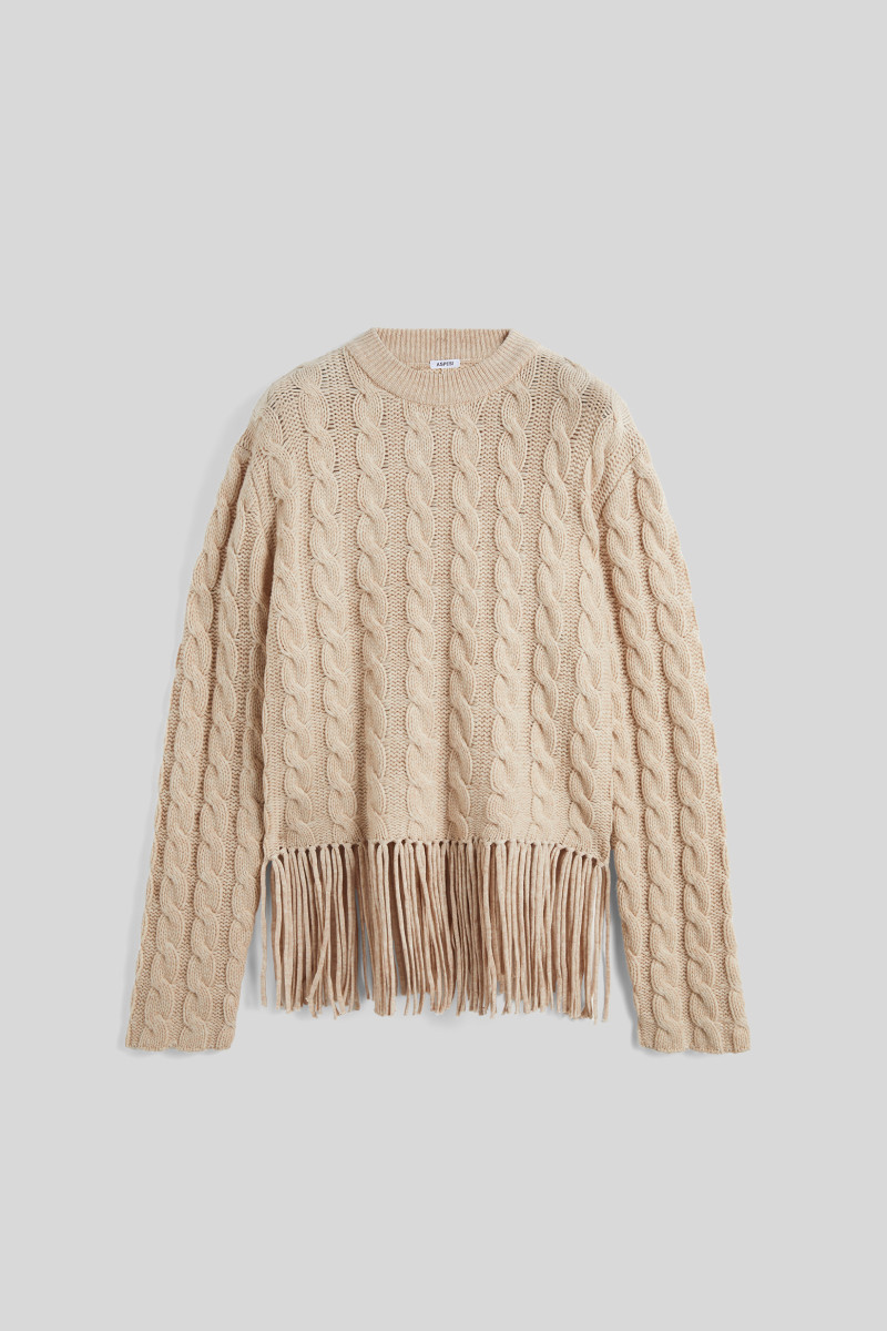 Női gyapjú pulóver, amely teljes felületén kötött mintával díszített. Laza dizájnja kerek nyakkivágással és lehulló vállakkal kiegészül, valamint bordázott szegély a nyaknál és feltűnő rojtokkal az alsó szegélynél. A minőségi kötés prémium természetes anyagból biztosít tökéletes légáteresztő képességet, melegséget és kényelmes viseletet. A pulóver könnyű, nem gyűrődik és nem szívja magába a szagokat. Kiválóan kombinálható darab modern fazonban, amely stílusosan kiegészíti téli öltözékedet.