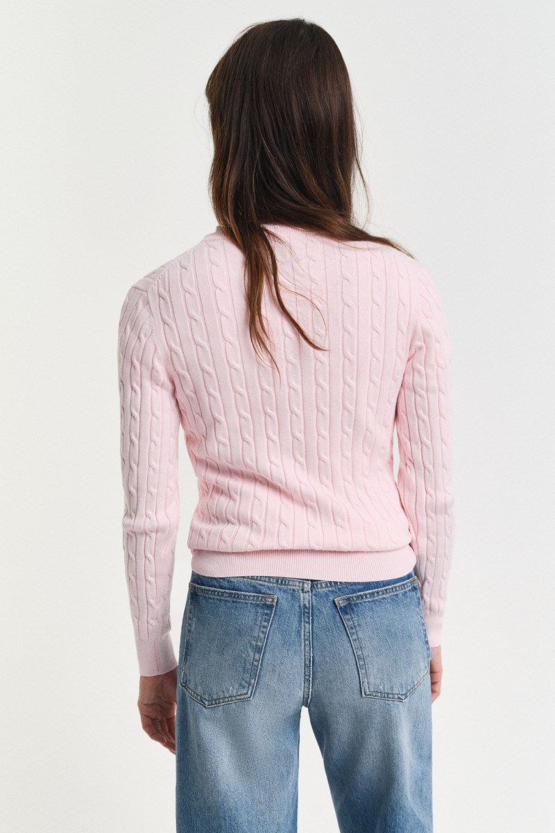 Női pulóver, amely rugalmas anyagból készült, ikonikus textúrájú és mellkasán hímzett Gant logóval van kiegészítve. A nőies, V-nyakkivágással ellátott darab szűk szabású és szegélyek teszik praktikussá a derékrészen és az ujjakon - így tökéletesen alkalmazkodik viselője alakjához. Anyaga kellemesen puha pamutszálból készült, amely melegen tart, ugyanakkor légáteresztő. Kényelmes, könnyen kombinálható darab, amely időtálló dizájnú és nem hiányozhat egyetlen lezser, ugyanakkor elegáns ruhatárból sem.