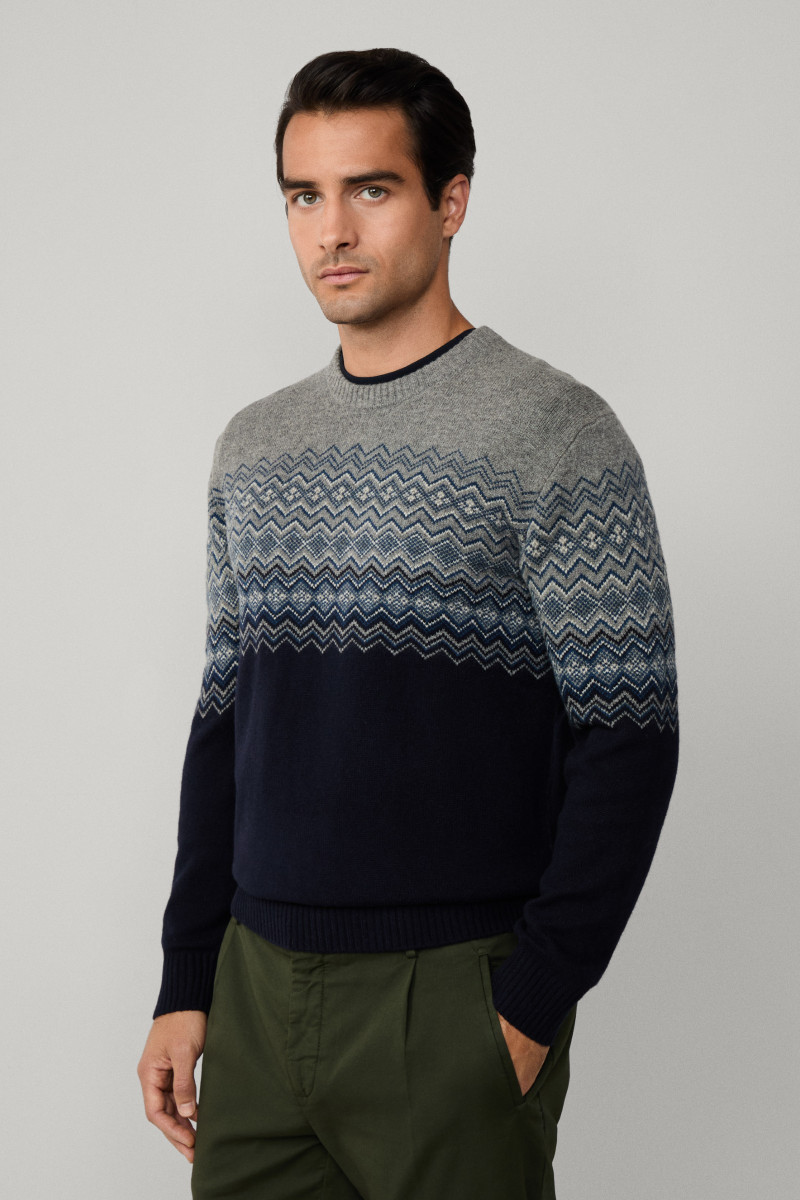 Férfi pulóver, amely egyenes szabású és rugalmas szegély teszi praktikussá az alsórészén, valamint az ujjakon. Kerek nyakkivágással és elülső oldalán jacquard mintával, amely összhangban van a kényelmes és univerzális darab időálló dizájnjával. A könnyű kötött anyag 100%-ban finom merinó gyapjúból készült, így kellemesen melegen tart és légáteresztő képességet biztosít. A luxus hatást keltő szál selymes fényű, így a darab lezser, ugyanakkor elegáns ruhatárának alapjává válik.