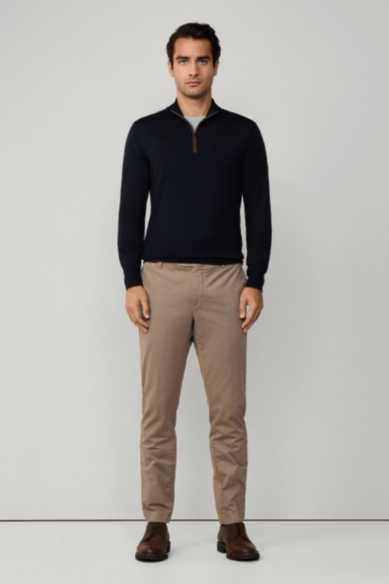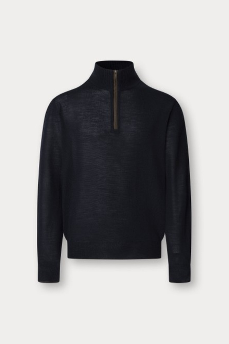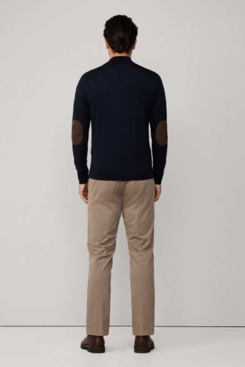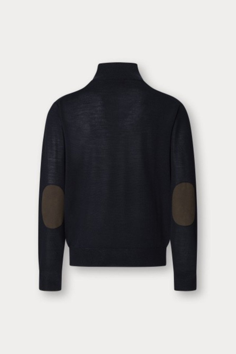 Állógallérban végződő rövid cipzárral ellátott férfi pulóver. A rendkívül kényelmes darab egyenes szabású és az alján, valamint az ujjakon elasztikus szegélyek teszik praktikussá - ezeknek köszönhetően a pulóver tökéletesen alkalmazkodik viselője alakjához és remekül mutat. A cipzár körül kontrasztos szegéllyel, amely színben harmonizál a könyöknél található díszelemekkel - így az időálló dizájnú darab remekül kombinálható. Anyaga prémium minőségű gyapjú és selyem kombinációjából készült, így fényes kialakítású, kellemesen melegen tart, ugyanakkor azonban tökéletes légáteresztő képességet biztosít. Stílusos alapjává válik lezser, ugyanakkor elegáns ruhatárának.