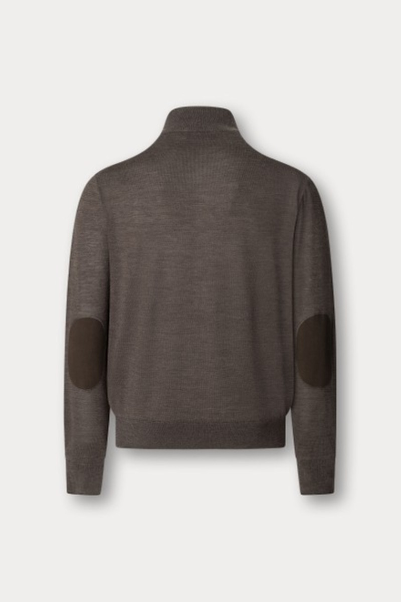 Állógallérban végződő rövid cipzárral ellátott férfi pulóver. A rendkívül kényelmes darab egyenes szabású és az alján, valamint az ujjakon elasztikus szegélyek teszik praktikussá - ezeknek köszönhetően a pulóver tökéletesen alkalmazkodik viselője alakjához és remekül mutat. A cipzár körül kontrasztos szegéllyel, amely színben harmonizál a könyöknél található díszelemekkel - így az időálló dizájnú darab remekül kombinálható. Anyaga prémium minőségű gyapjú és selyem kombinációjából készült, így fényes kialakítású, kellemesen melegen tart, ugyanakkor azonban tökéletes légáteresztő képességet biztosít. Stílusos alapjává válik lezser, ugyanakkor elegáns ruhatárának.